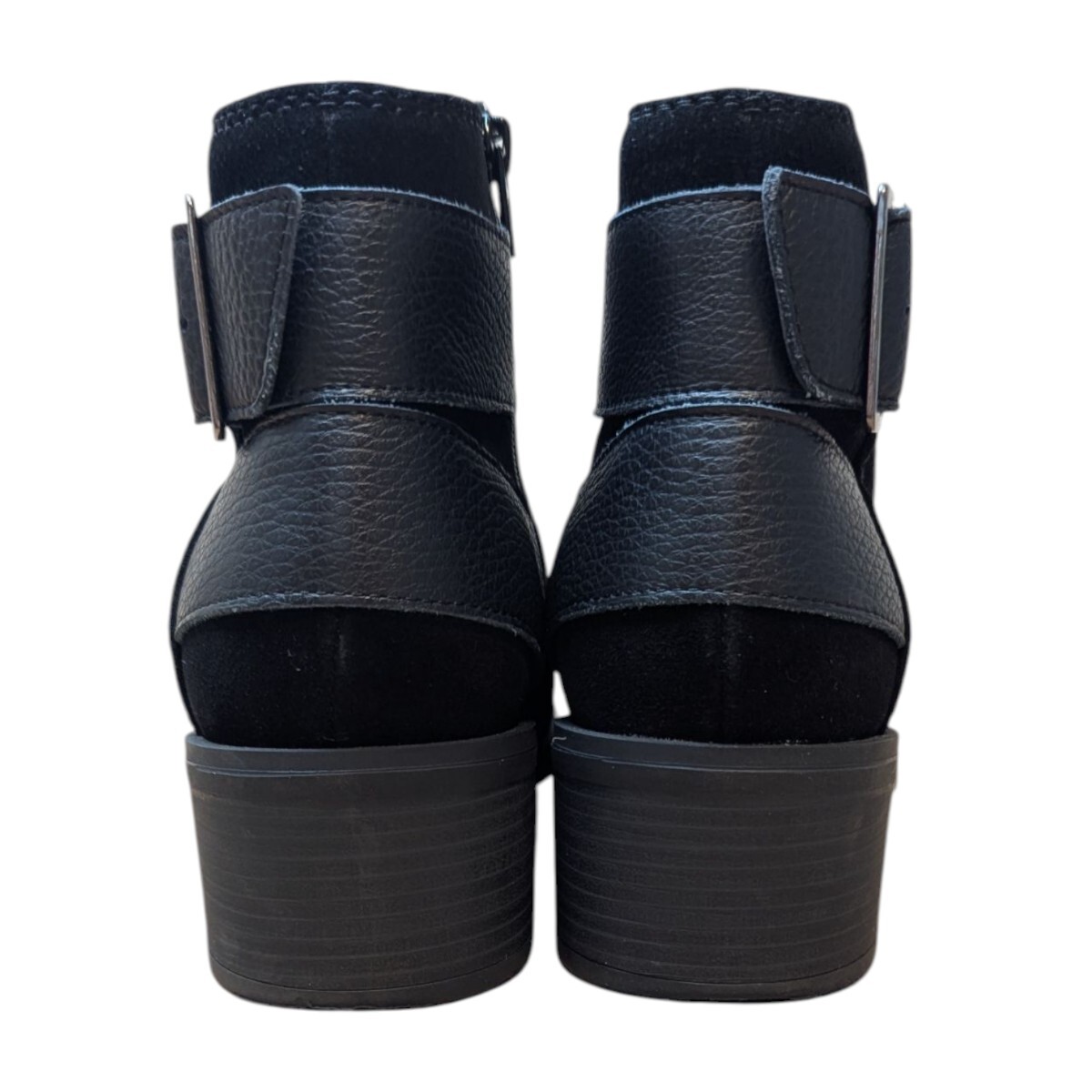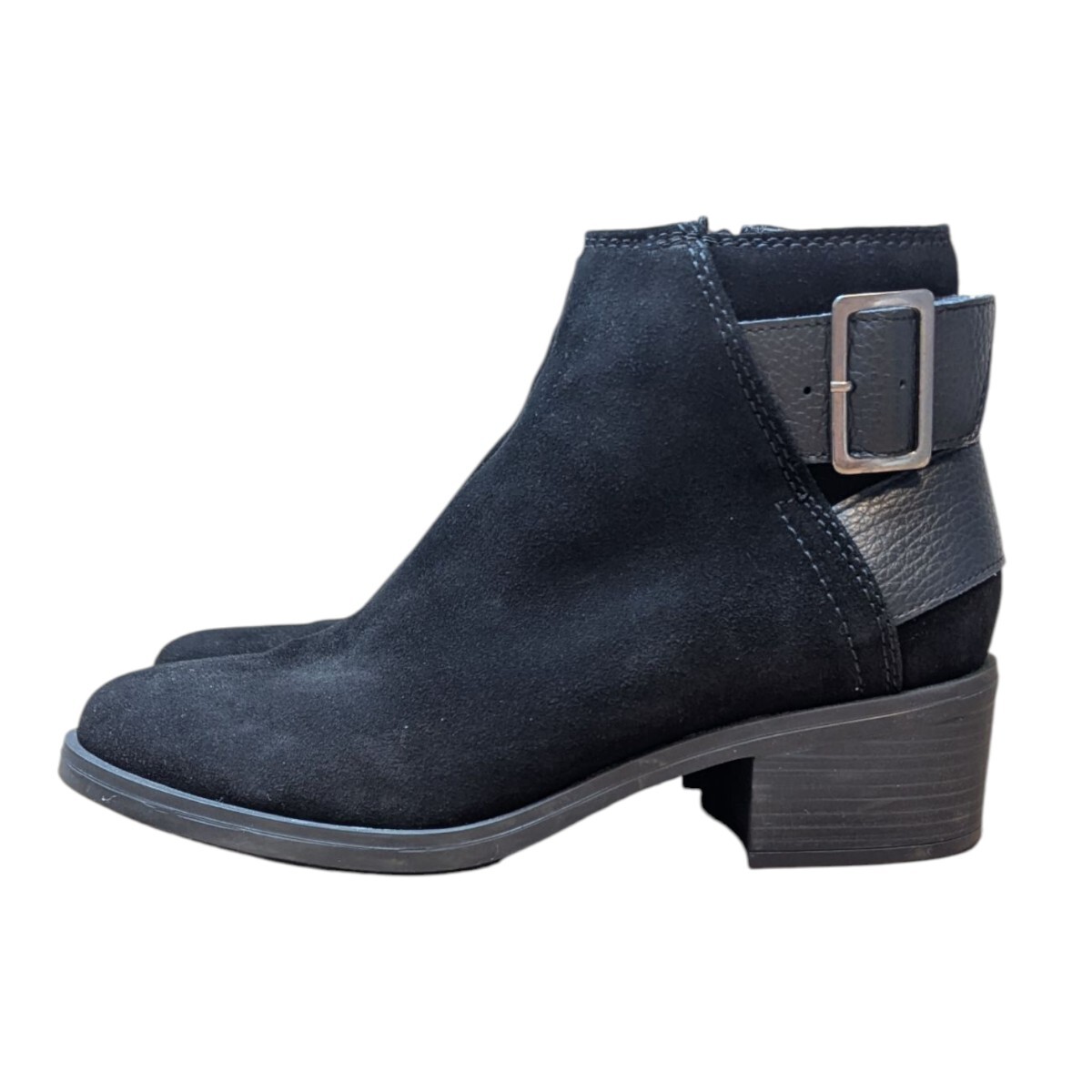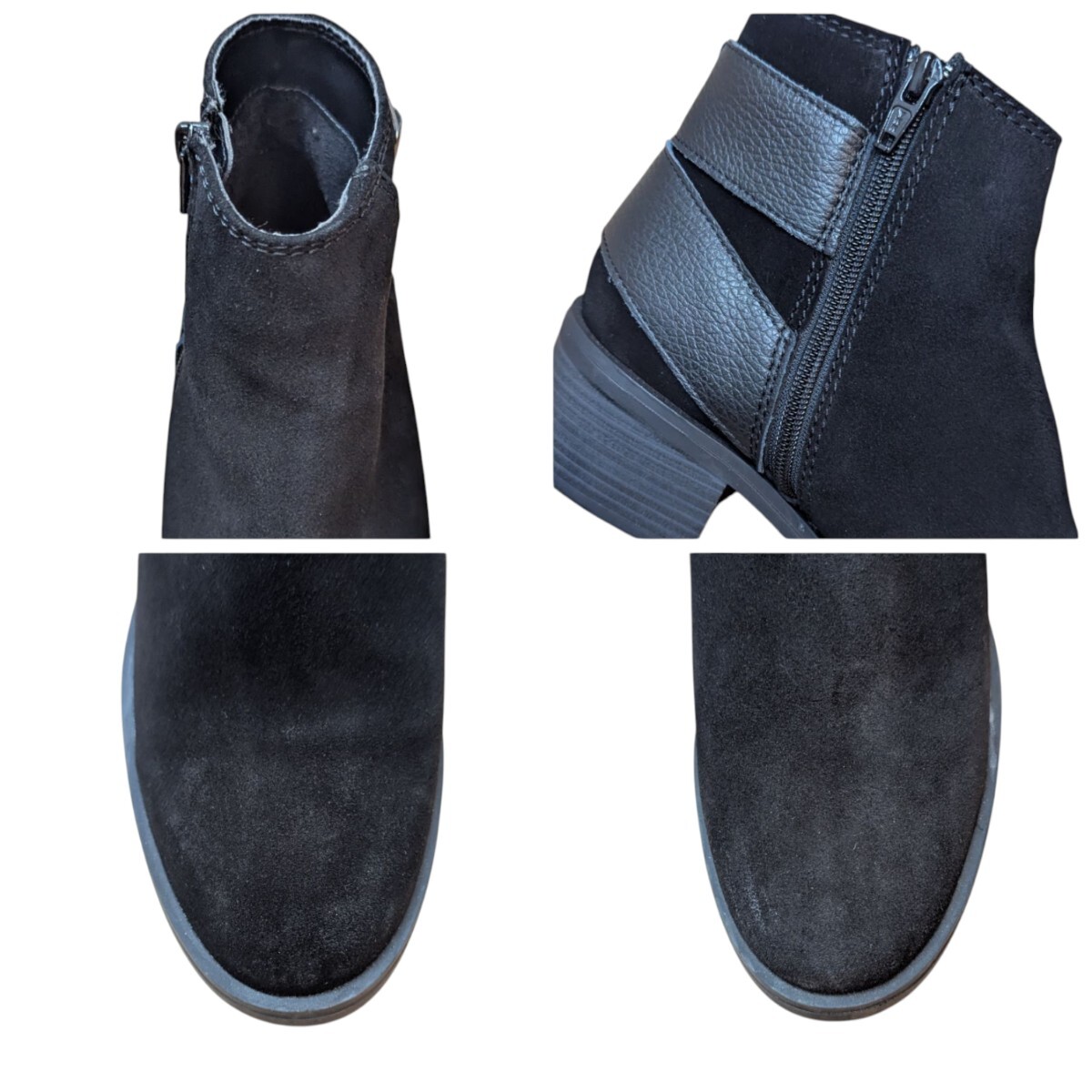 太目ベルトがポイントのショートブーツ。バックルと太目のベルト使いで、横顔にも後ろ姿にも表情がある、シンプルながらもおしゃれな一足。異素材の組み合わせもポイントです。安定感のある太ヒールと、柔らかなクッションで快適な履き心地。解剖学的観点から最適な位置に配された二重密度の衝撃吸収クッションであるCushion Plusをインソールに搭載。快適な履き心地でに足への負担を軽減します。
