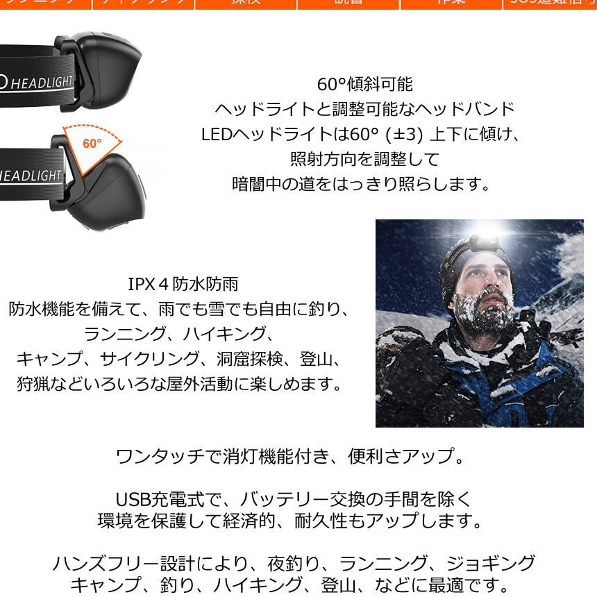 ヘッドランランプの照射方向は60°まで角度調整可能(±3)、簡単に照らしたい場所へ集中できます