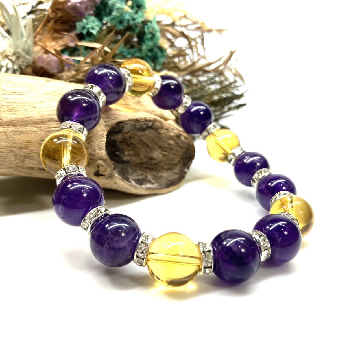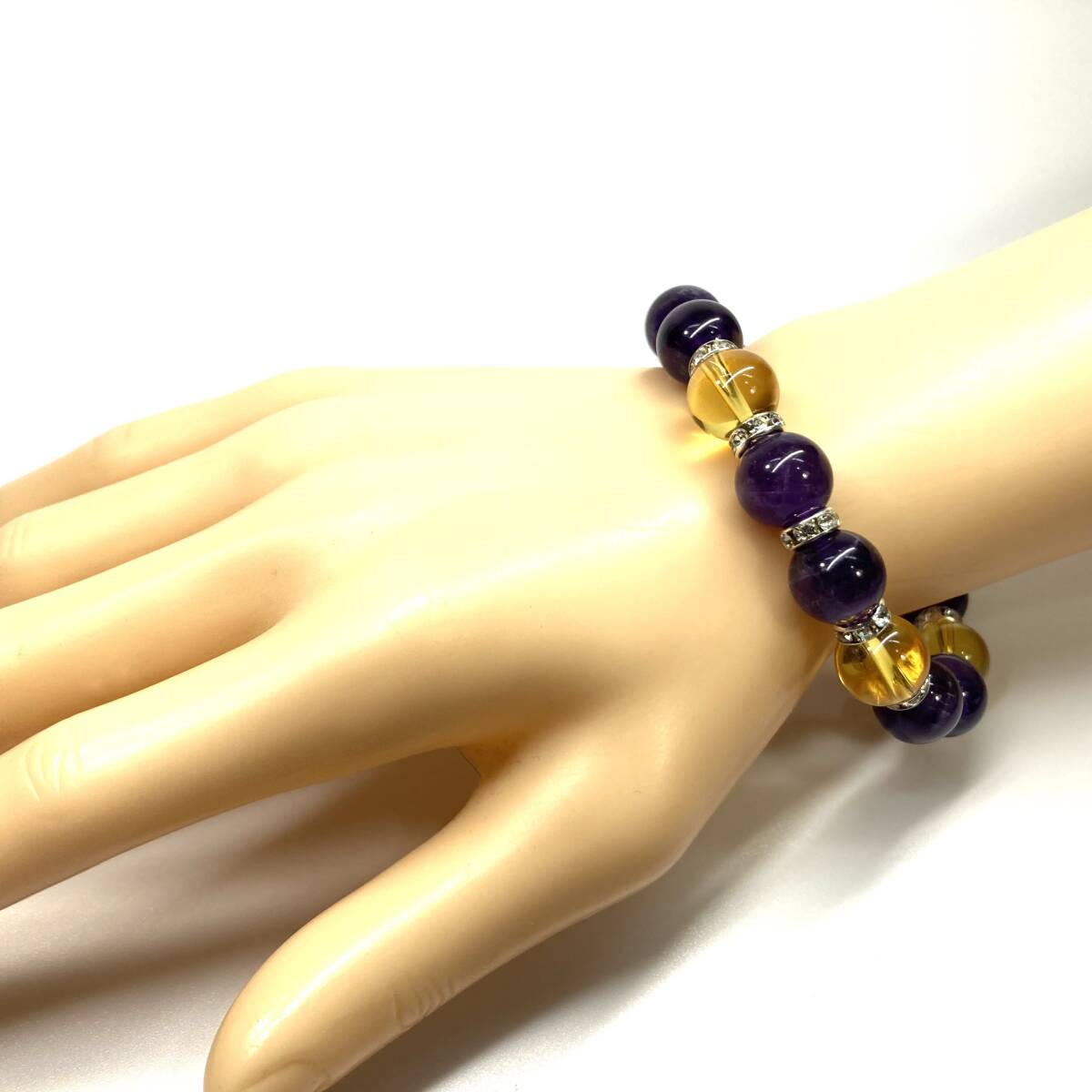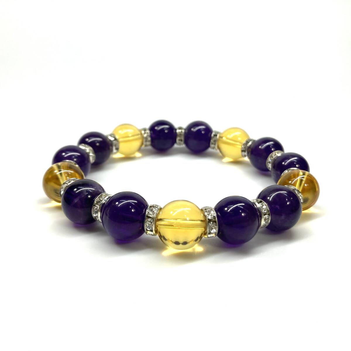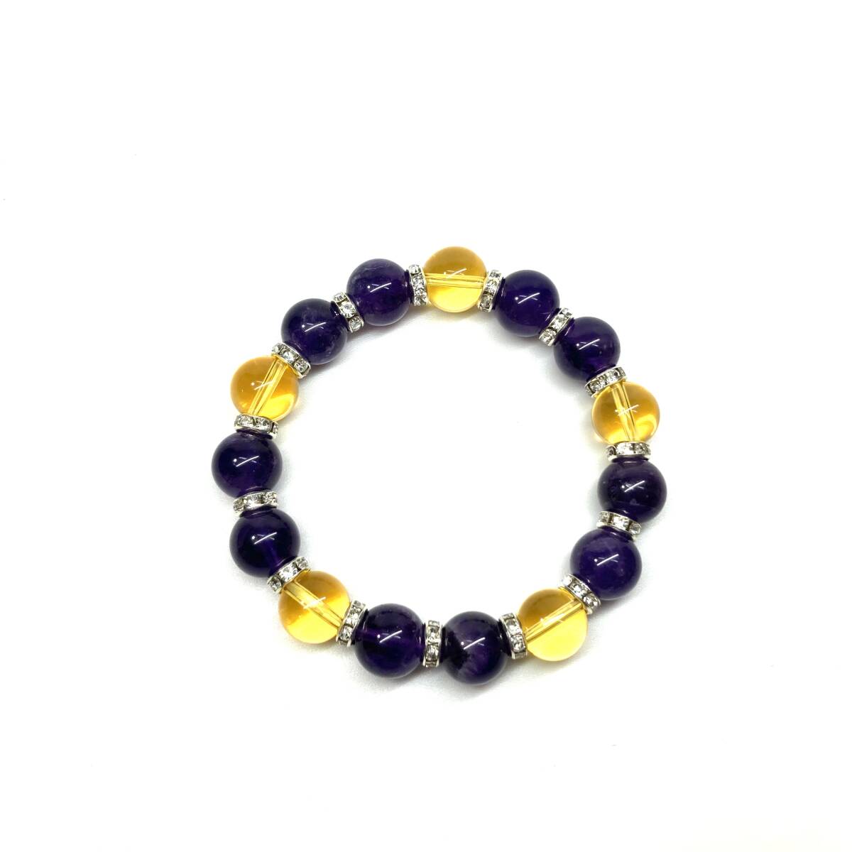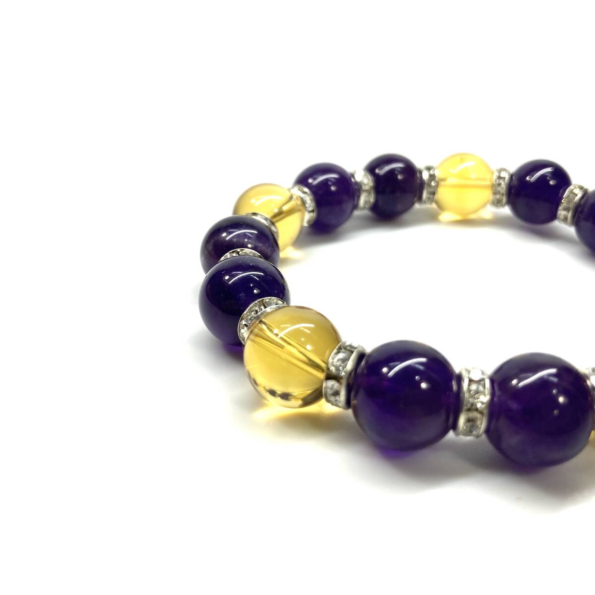 こちらは、シトリンとアメジストを組み合わせたパワーストーンブレスレットです。間にはロンデルを挟み高級感あるデザインに仕上げております。石大きさは12mm玉を使用して内周約18cmです。気になる方は是非この機会にどうぞ。