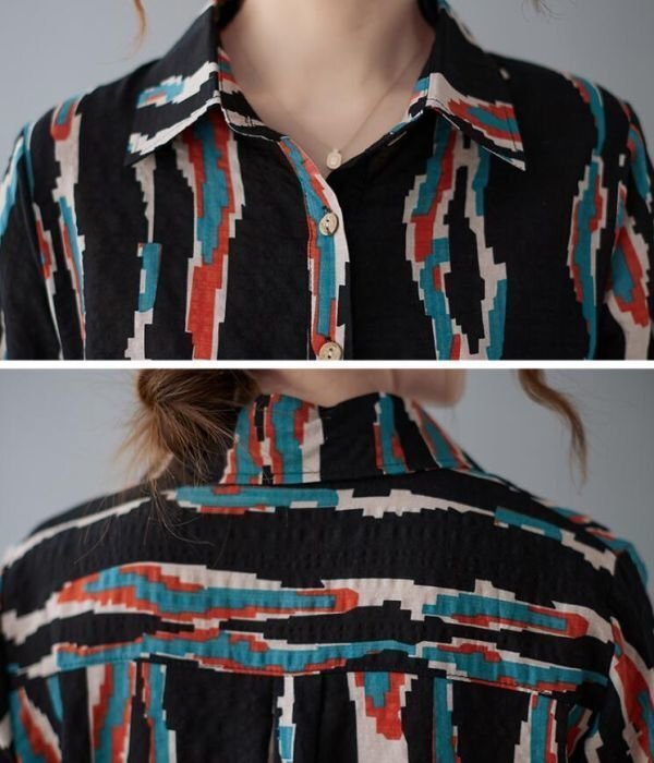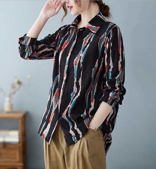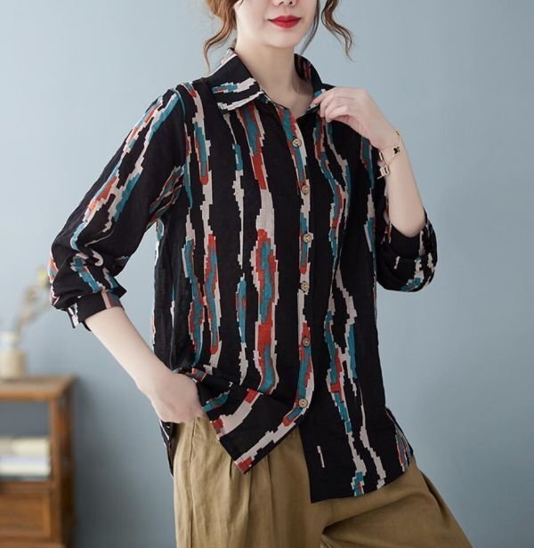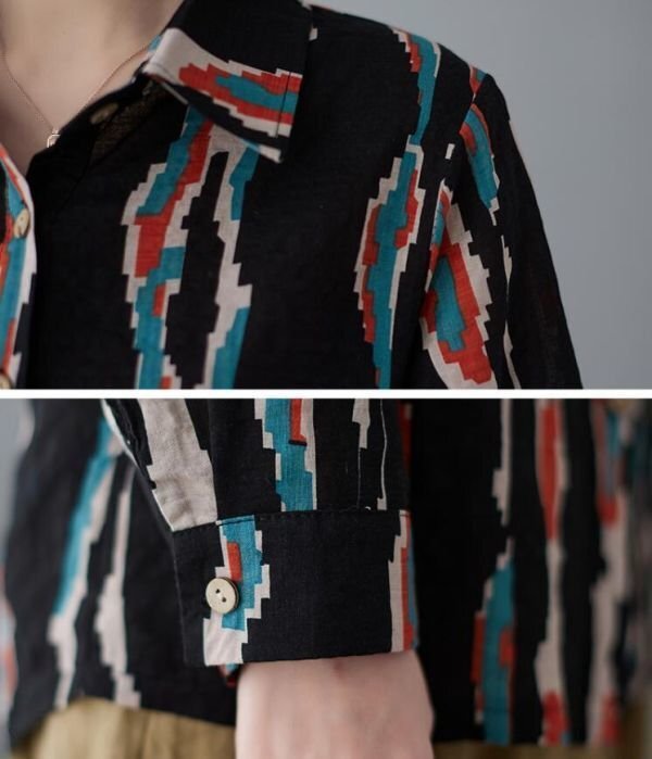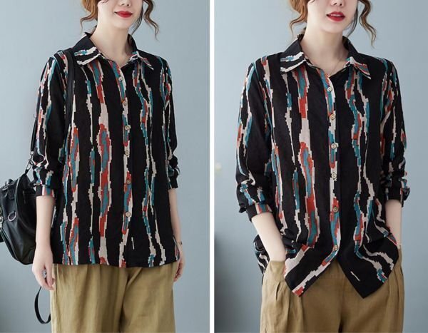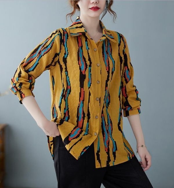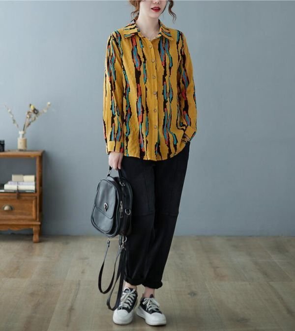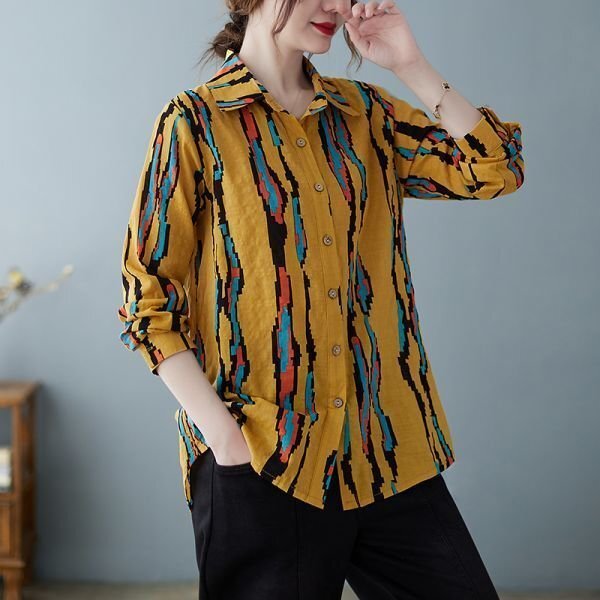 春新品 カジュアルゆったり プリント柄 コットン 20304050代 大きいサイズ 長袖 シャツブラウストップス ★黄/XLサイズ