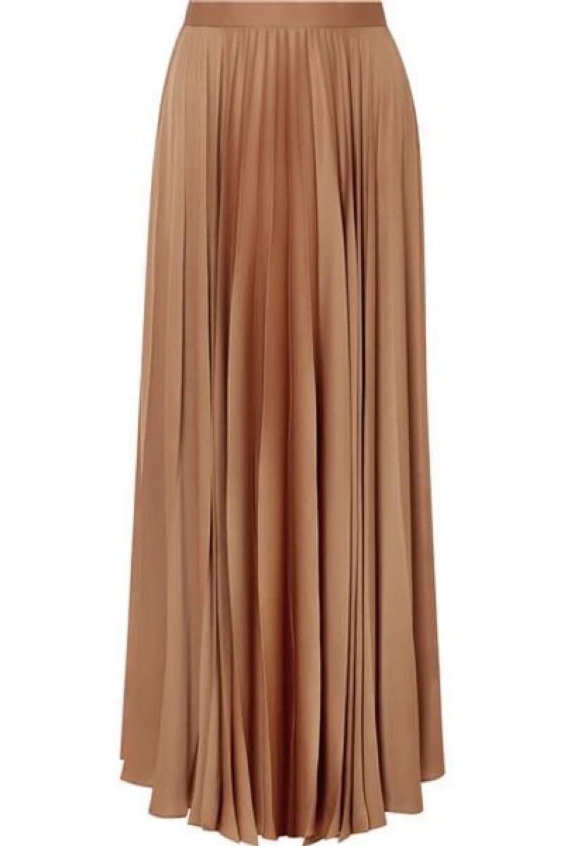 光沢がギラギラしすぎず上品で、たっぷりとられたプリーツが歩くたびに優雅に揺れます。