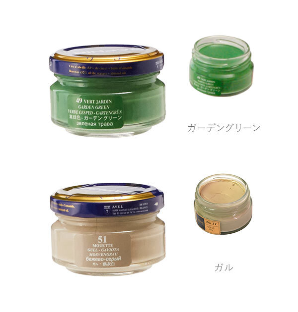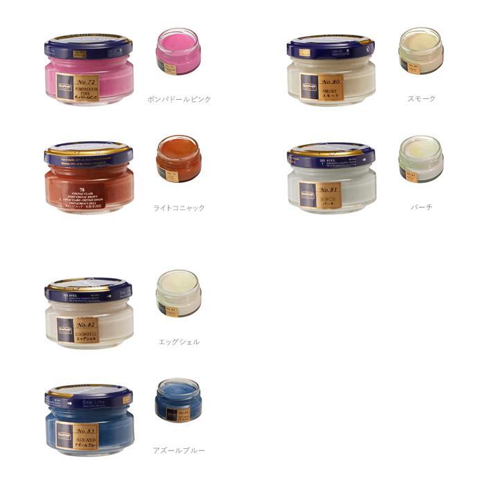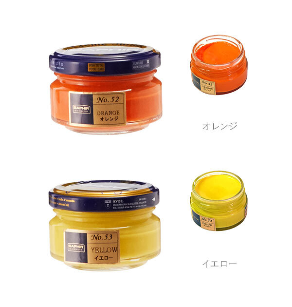 商品説明 | 保革効果に優れたビーズワックスベースの、アーモンドオイル配合のツヤ革専用の保革・ツヤ出し高級靴クリームです。伸びの良い乳化性クリームで、染料の定着がよく、補色効果が高いことが特徴です。また、ビーズワックスの配合率が高く、革に対する、栄養・保革効果、光沢・汚れ落とし効果があります。全18色の豊富なカラーバリエーションを取り揃えておりますので、お手持ちのアイテムの色に合わない場合は、複数のカラーを混ぜ合わせてお好みのカラーを作ることもできます。ご愛用の革靴製品のお手入れにぴったりです。 |