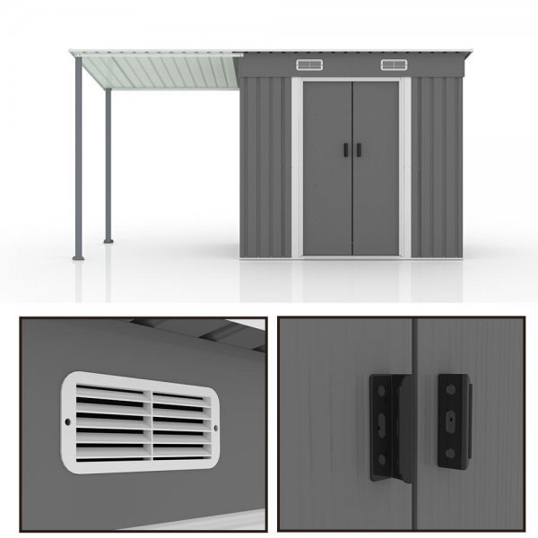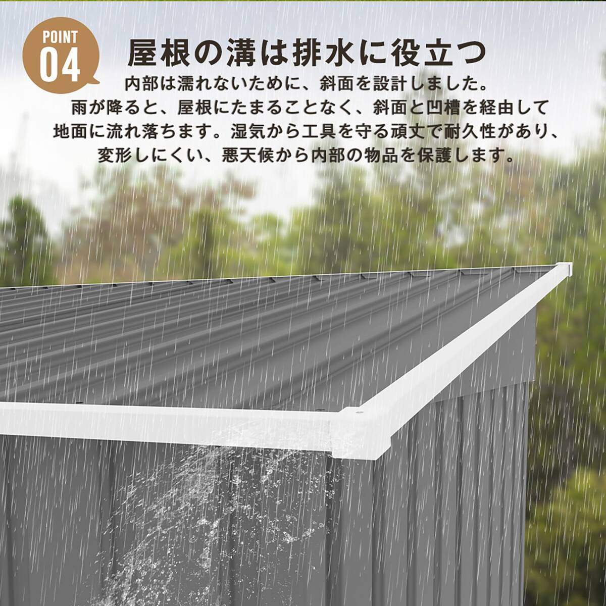 【屋根の溝は排水に役立つ】内部は濡れないために、斜面を設計しました。雨が降ると、屋根にたまることなく、斜面と凹槽を経由して地面に流れ落ちます。湿気から工具を守る頑丈で耐久性があり、変形しにくい、悪天候から内部の物品を保護します。