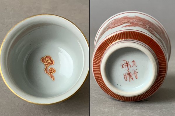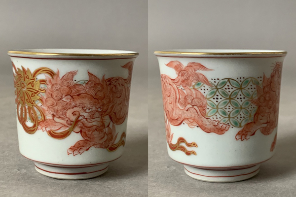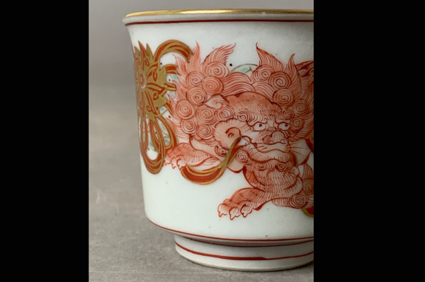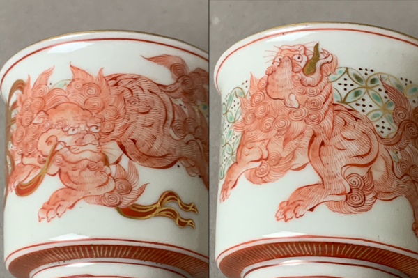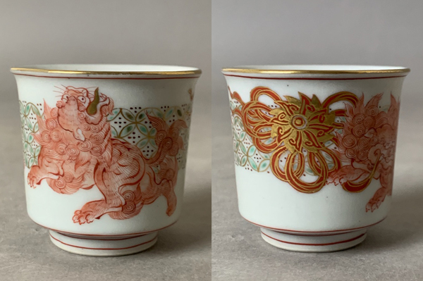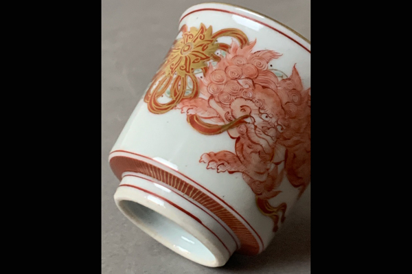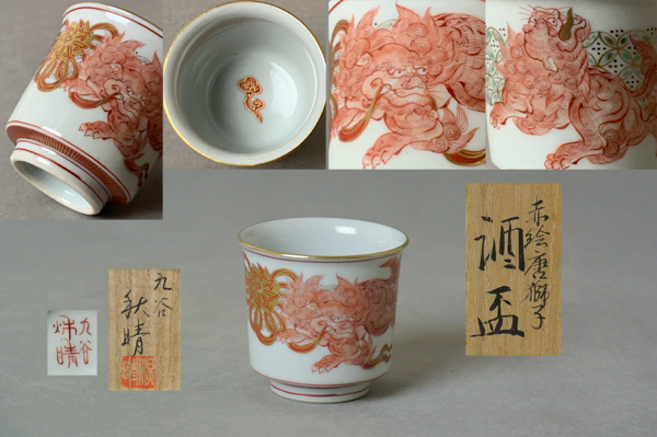 【 九谷 井上秋晴 赤絵 唐獅子 酒盃 共箱・共布付き】 |