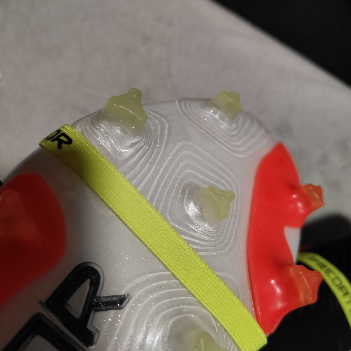 未来を見据えたデザインのこのモデルは、ストライクゾーン全体にグリップ力を発揮するハイデフィニションテクノロジーを搭載し、サポート感のあるシューレースと、足入れしやすいツーピース構造のPRIMEKNITを採用している。ボールを足に吸い付かせ、正確なシュートが打てるように、戦略的にラバーフィンを配置。