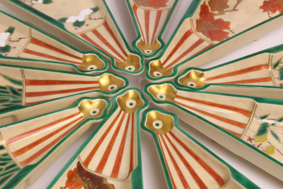 6代 高橋道八 色絵画 変扇面底 皿 10枚「共箱」