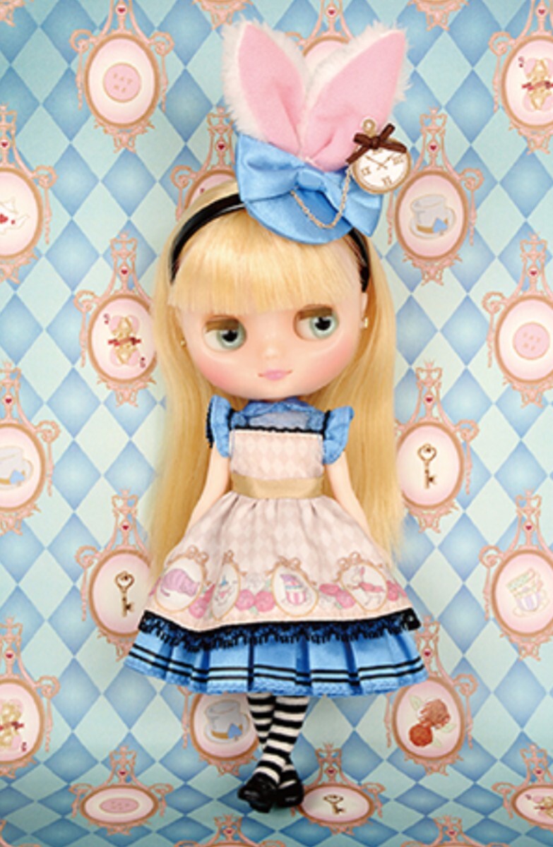 アリスブルーなドレスにちょっとオトナな色味の大きめエプロン、アリスなボーダーニーハイソックス、うさぎ耳と懐中時計がついたリボンつきヘッドドレスがセット内容なアウトフィットです。