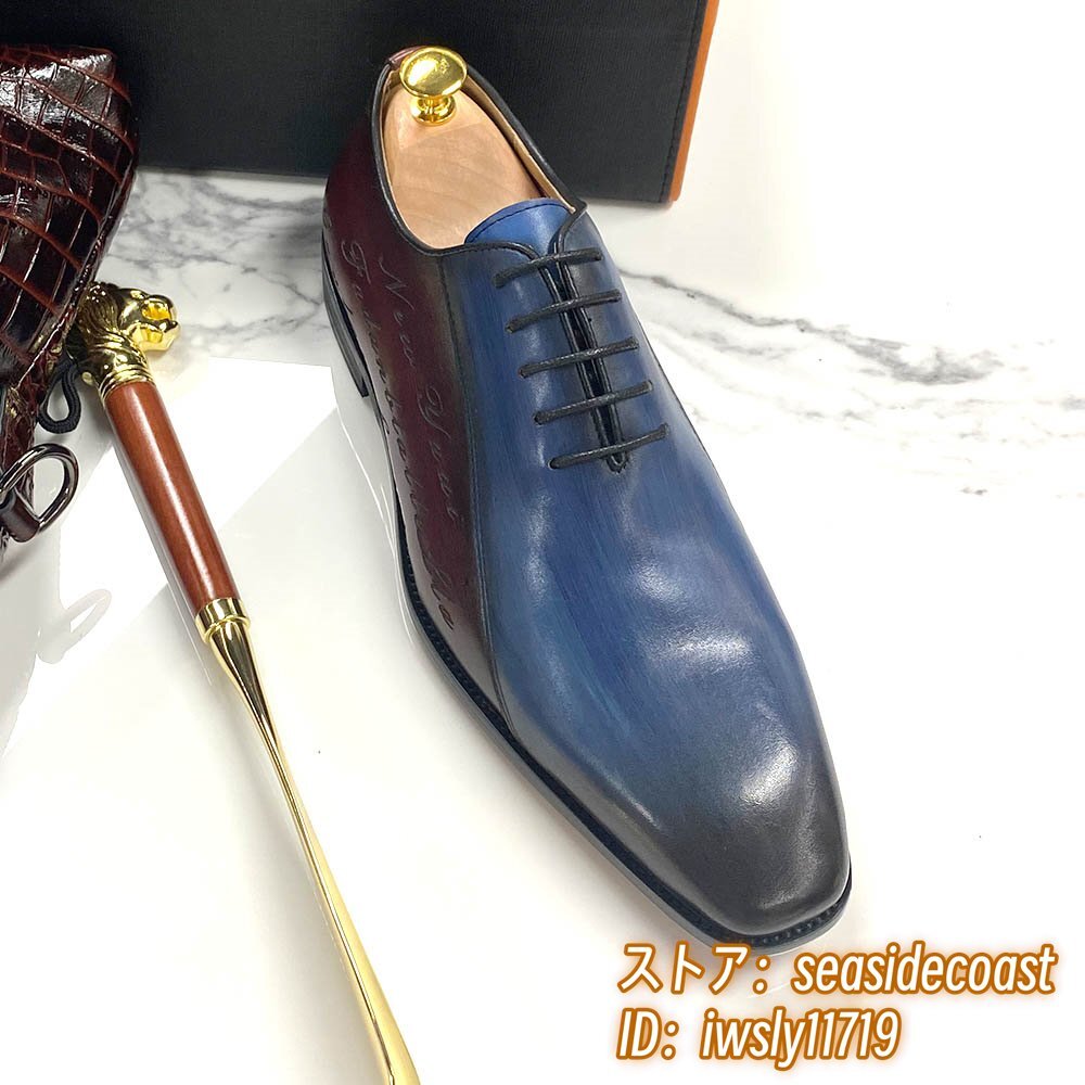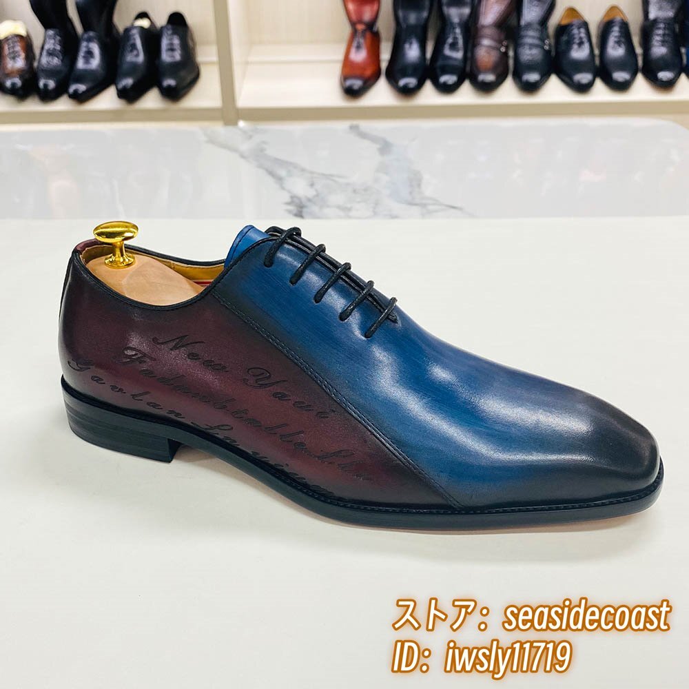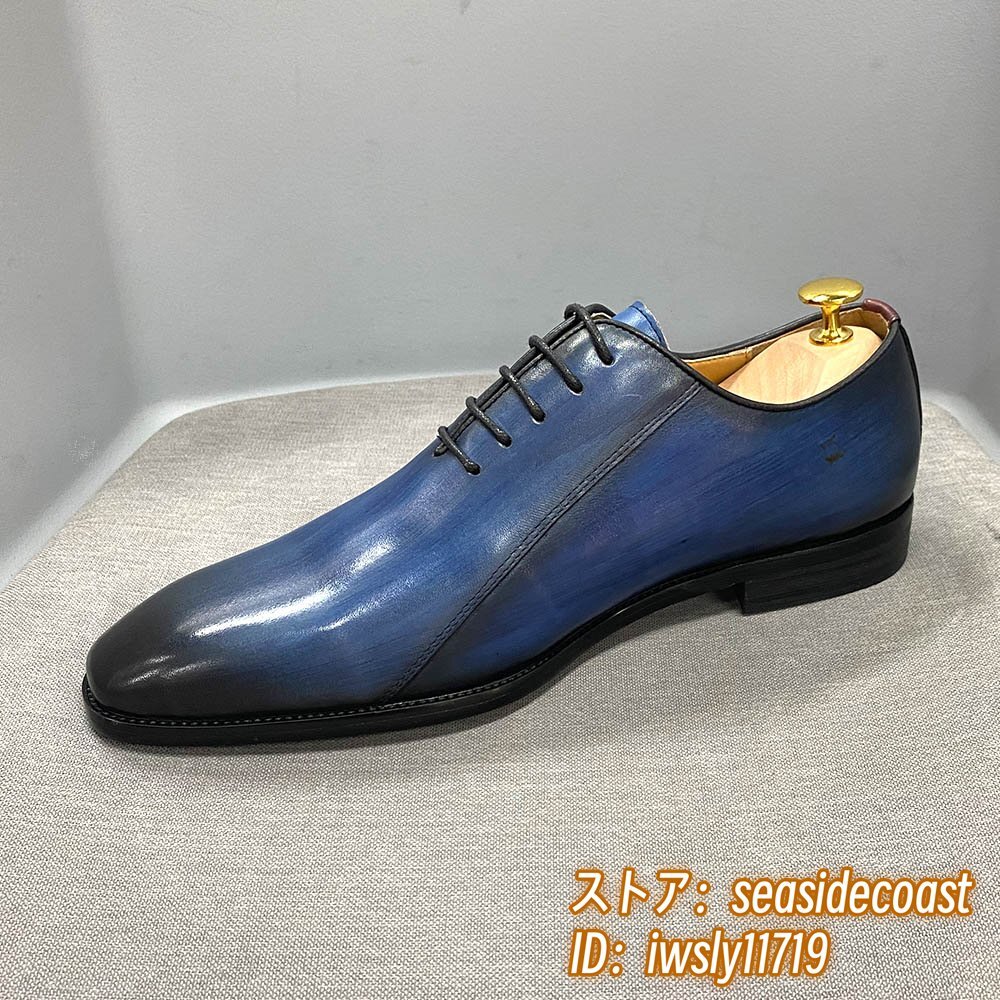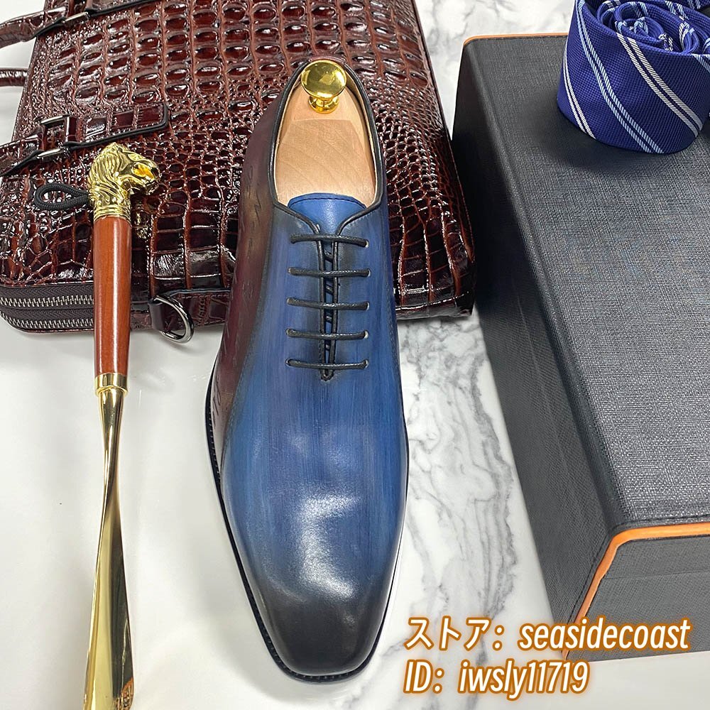 超希少★定価9万超 切替 ビジネスシューズ メンズ 本革レザーシューズ 職人手塗り上げ 彫り 高級牛革 紳士靴 フォーマル革靴 ブルー 27.5cm