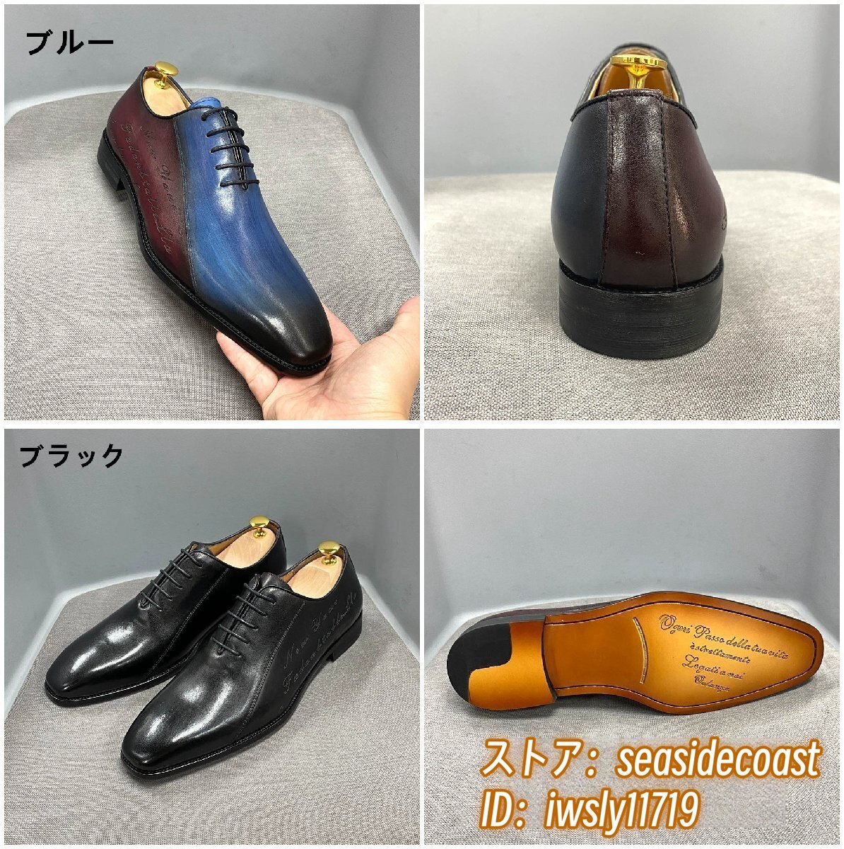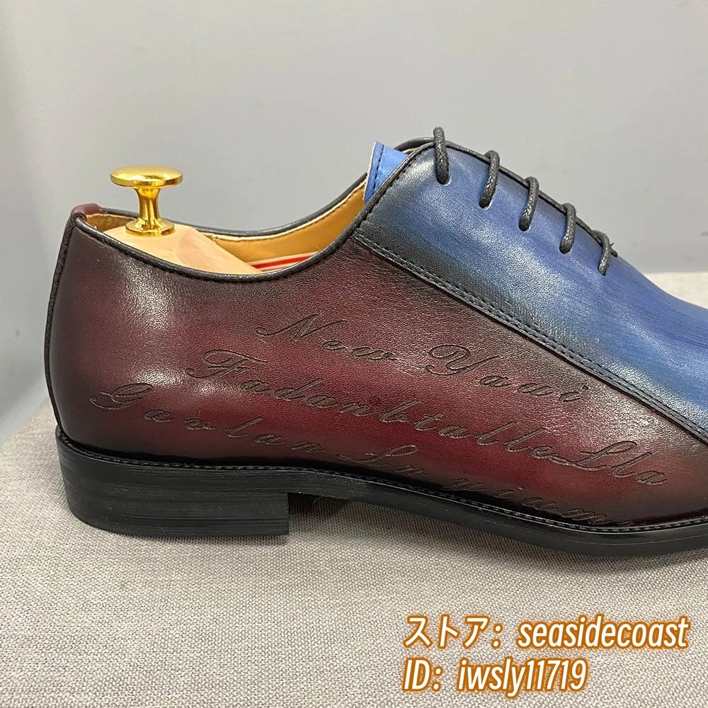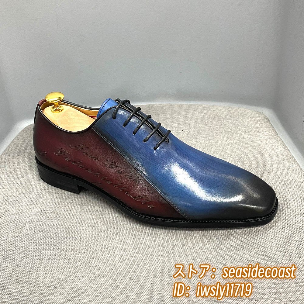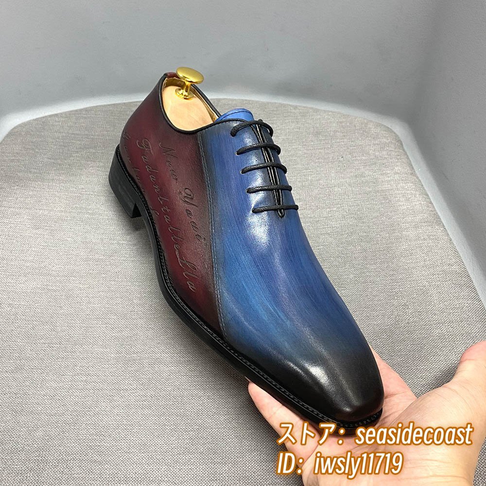 超希少★定価9万超 切替 ビジネスシューズ メンズ 本革レザーシューズ 職人手塗り上げ 彫り 高級牛革 紳士靴 フォーマル革靴 ブルー 27.5cm