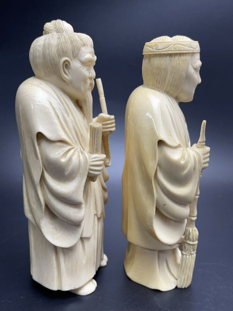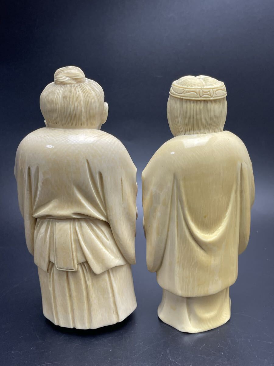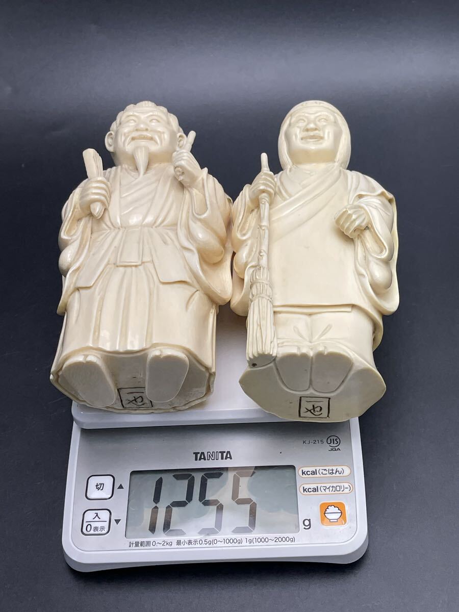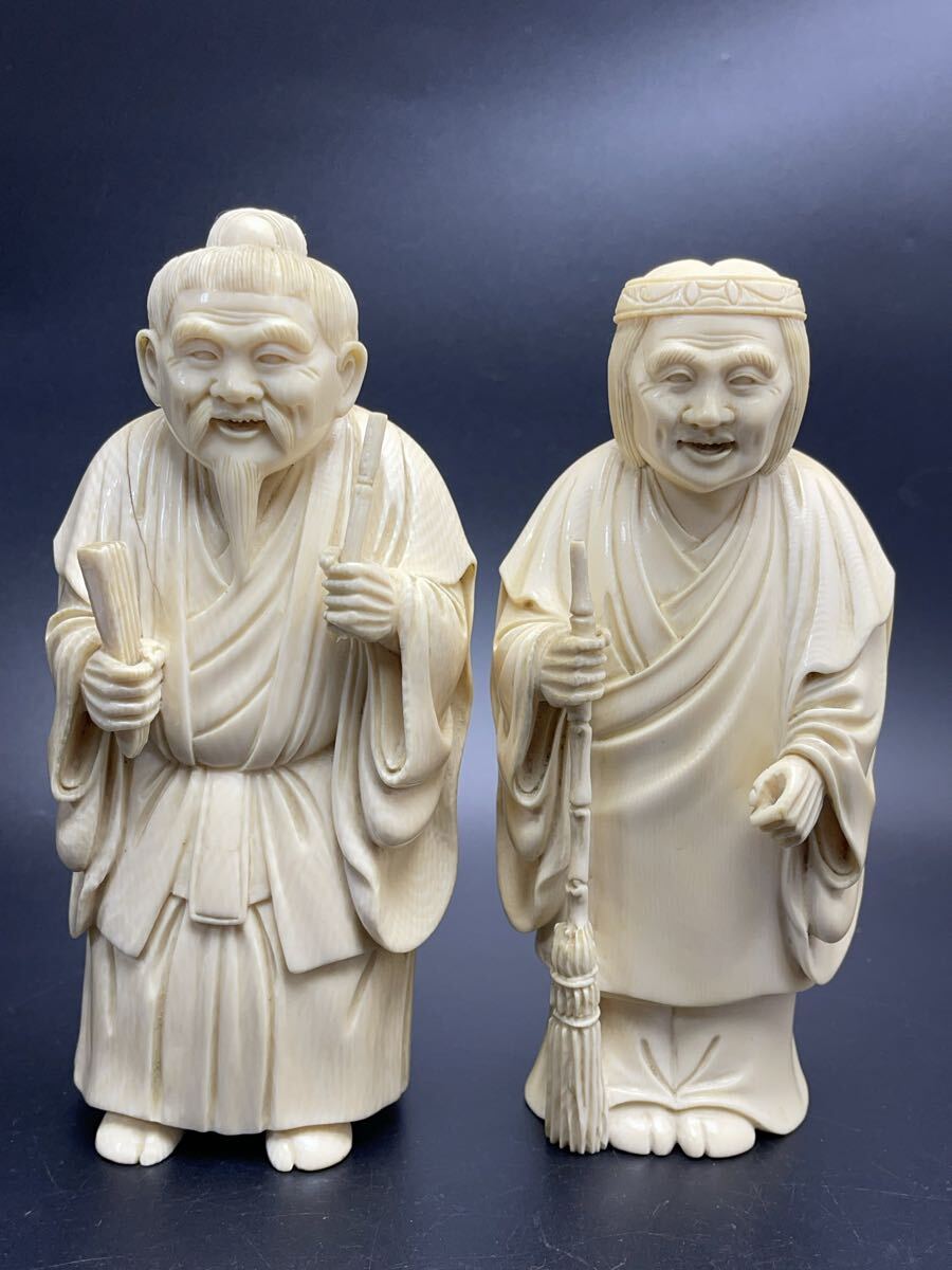 A1k7 鯨歯風高砂夫婦置物 作家物 1255g 一也在銘 細密彫刻 天然素材 中国美術 東洋彫刻