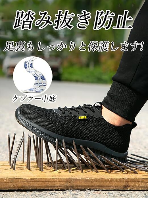【安全性能】高強度な鋼鉄製先芯を採用し、重量物の落下衝撃からつま先をしっかりと守ります。さらに、1,100Nの超高耐穿刺力を誇るケブラー中底を搭載し、釘や金属片などの尖った物から足裏を完全に防御します。