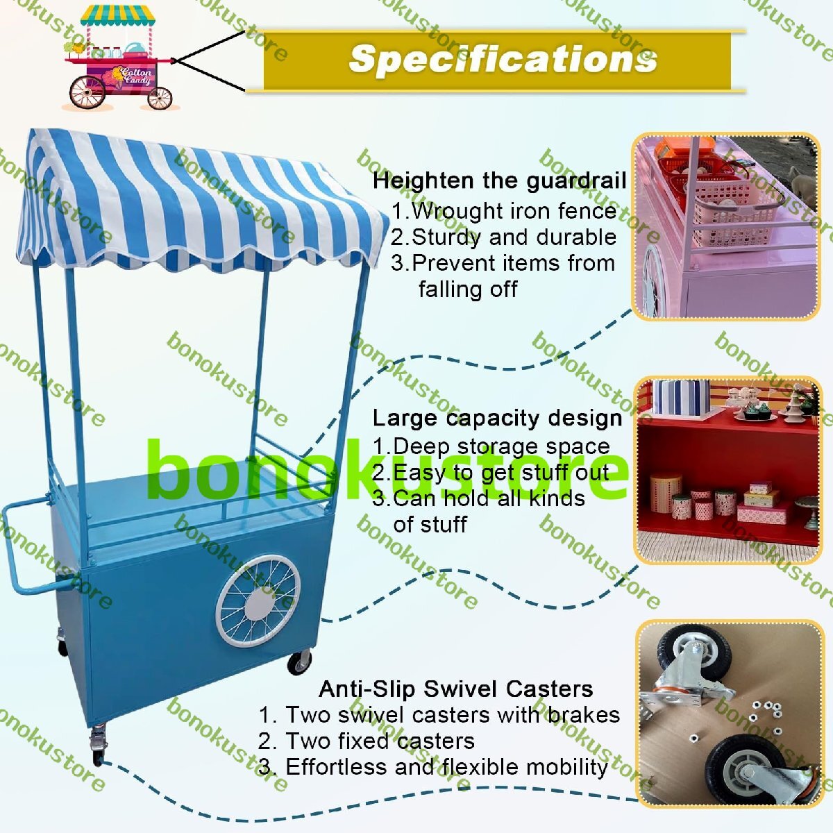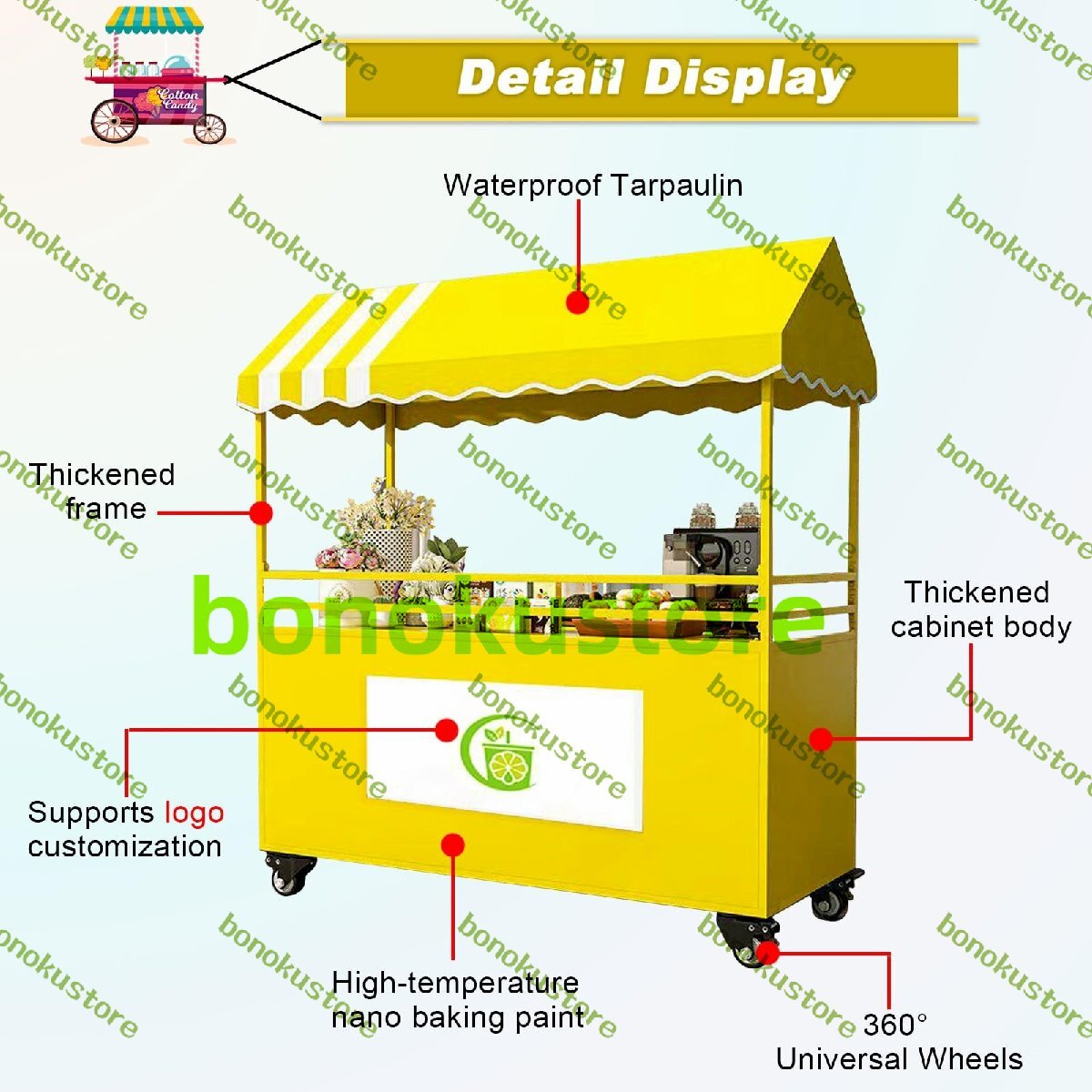 移動式カートの素材:安定性と耐久性に優れた頑丈な錬鉄製フレームを採用し、高温焼き付け塗装で鮮やかな発色と傷に強い仕上がりを実現。ポリエステル製のキャノピーはPUコーティング加工が施され、耐引裂性、耐老化性、防水性、耐候性を備え、長期間の使用に耐えます。