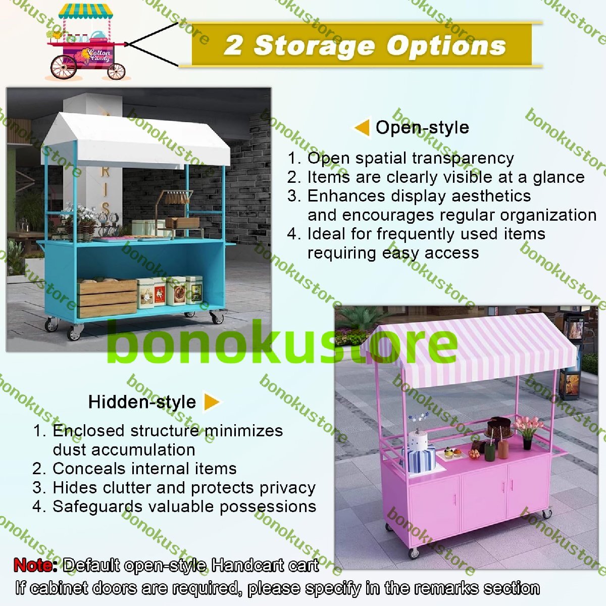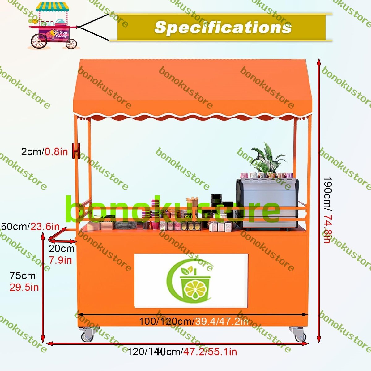 1. 軽量の商用モバイル販売カート - 単なるカートではなく、完全なモバイルストアフロントです2. その最大の価値は、「通行人」を「立ち止まる顧客」に変え、商品の魅力を活用して効率的に売上を伸ばすことにあります。3. 鉄や車輪を買うのではなく、視認性の向上、来店客の増加、そして最終的には売上に投資するのです。仕様:1. 材質:強化錬鉄2. 色: 白 | 黒 | 赤 | ピンク | 青 | 黄3. カウンタートップとキャビネットの耐荷重:75kg/220lb~150kg/331lb4. サイズ:長さはカスタマイズ可能①長さ:120cm / 47.2インチ、140cm / 55.1インチ(20cm / 7.9インチの手すりを含む)②カウンタートップの高さ:75cm / 29.5インチ(キャスターを含む)③幅:60cm / 23.6インチ④全高:190cm / 74.8cm5. 取り付け方法:セルフアセンブリ特徴:1. 複数の色が「視覚的衝動」を生み出す2. 大容量の収納コンパートメントが荷物の運搬ニーズを満たします3. 4つの回転キャスターが衝撃を吸収し、静かな動作を実現します。4. 固定されたカウンターの制限から解放され、楽に移動できます5. 滑らかな作業面により、掃除が簡単6. ガードレールを高くして落下を防ぐ7. キャノピーは屋外での予期せぬ雨、雪、日差しから保護しますパッケージは以下を含みます:モバイルカート1台回転キャスター4個レインカバー1個注記1. 手作業による計測のため、1cm程度の誤差が生じる場合があります。2.コンピュータの解像度により、実際に受け取った商品の色と異なる場合があることをご了承ください。