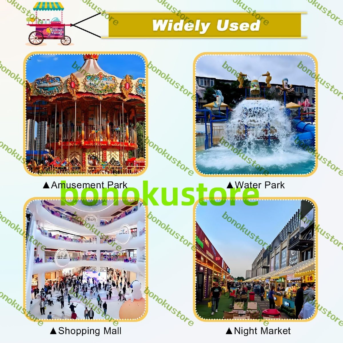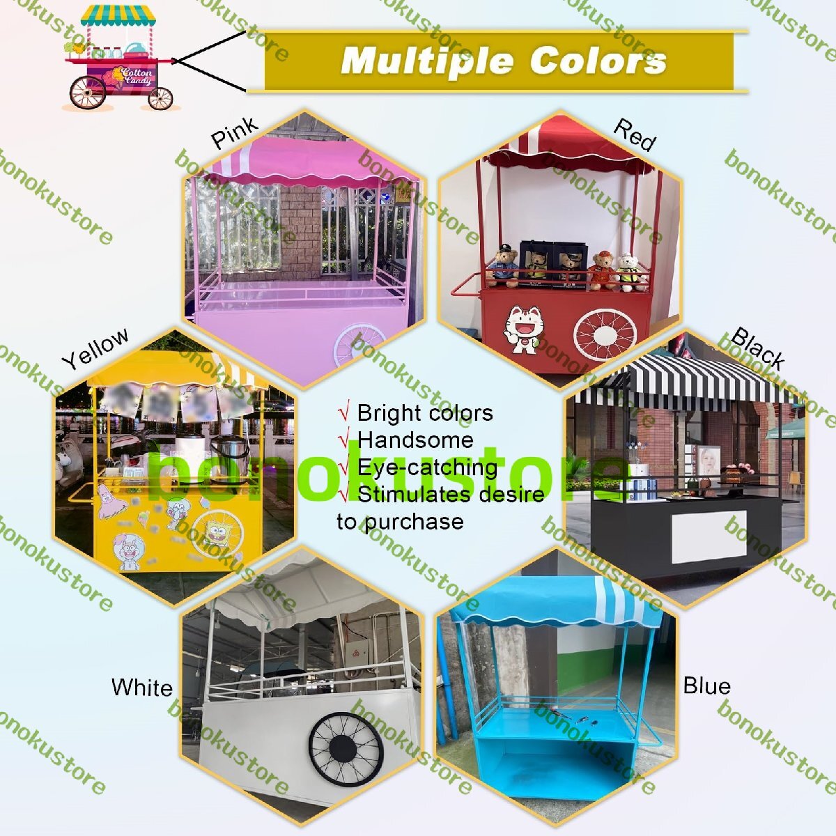 豊富なカラーバリエーション:視認性と訴求力を最大限に高め、あらゆる会場の目玉となり、ターゲット層を惹きつける多彩なカラーバリエーションをご用意しています。例えば、黄色:デザートショップ、ドリンクスタンド、赤:ホットドッグ、ハンバーガー、ポップコーン、黒:高級コーヒー、高級レストラン、白:花、フルーツなど、お客様のニーズに合わせてカラーをお選びください。