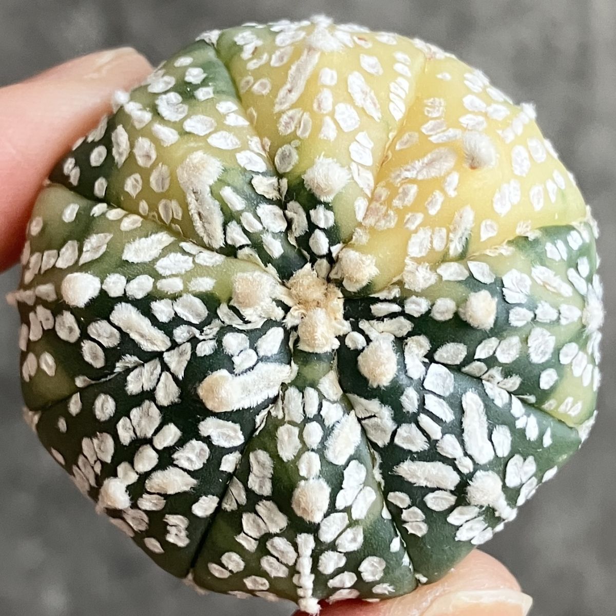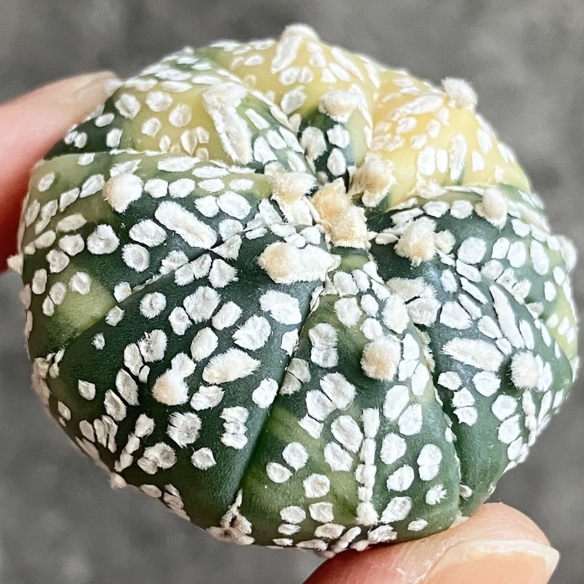 品名:超希少【 アストロフィツム ヴァエリガータ ' 瑠璃兜丸錦 '  】 Astrophytum asterias f. variegated 実生 サボテン 斑入り