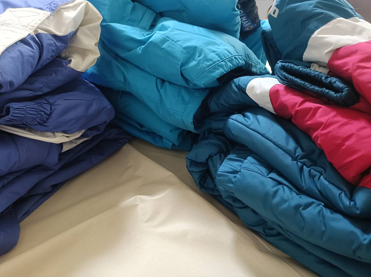 ・素材 水色上下はダウン・フェザーと記載あり。他の2セットは記載なくダウンかどうか不明です。