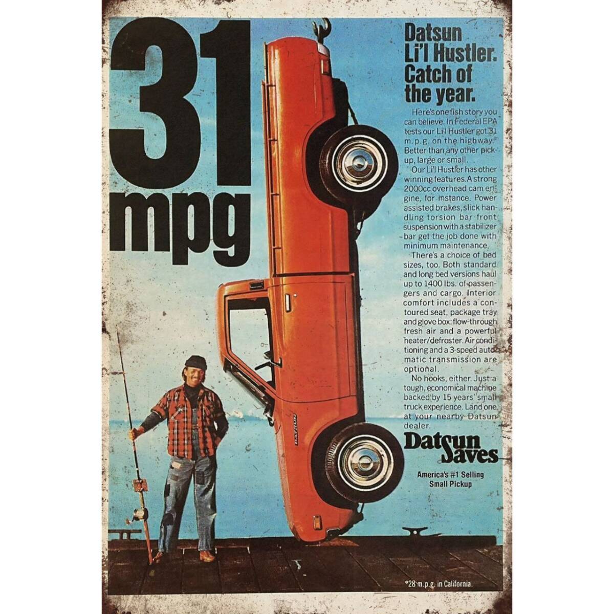 Datsun Li’l Hustler(ダットサン小型ピックアップ)の広告を再現したブリキ看板です。