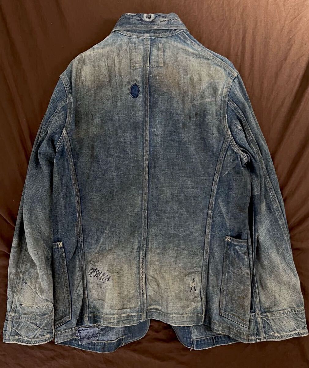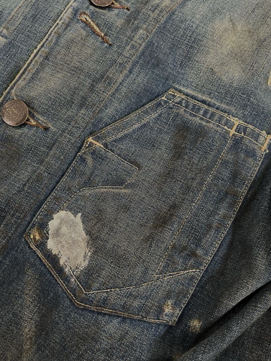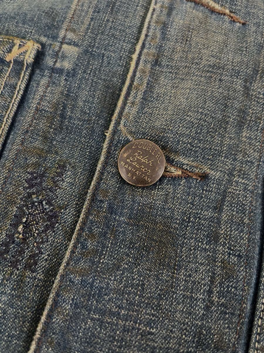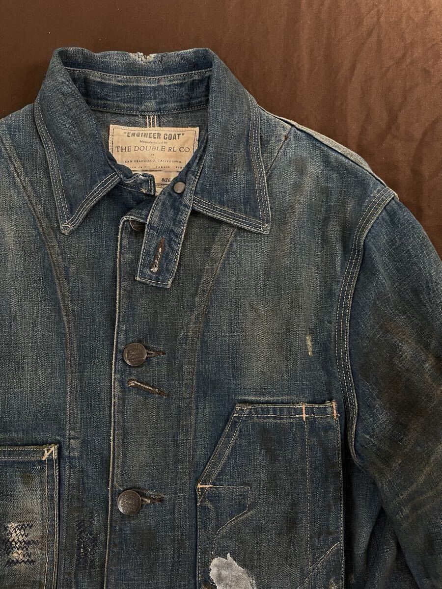 インディゴファンには堪らないイントネーション抜群のデニム地を使用し、数々のリペアや異デニムの当て布、油滴や補強跡に至るまで、あたかも当時物さながらのディティールは全てが個体ごとに異なる実質一点モノのもはや芸術品で、RRLの全アイテムの中でも屈指の加工群と最高の風合いを誇る生地感は見る者を圧倒します。