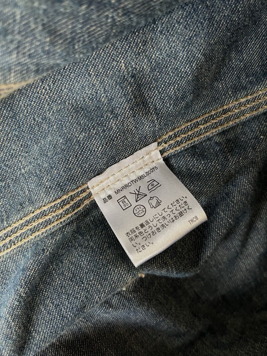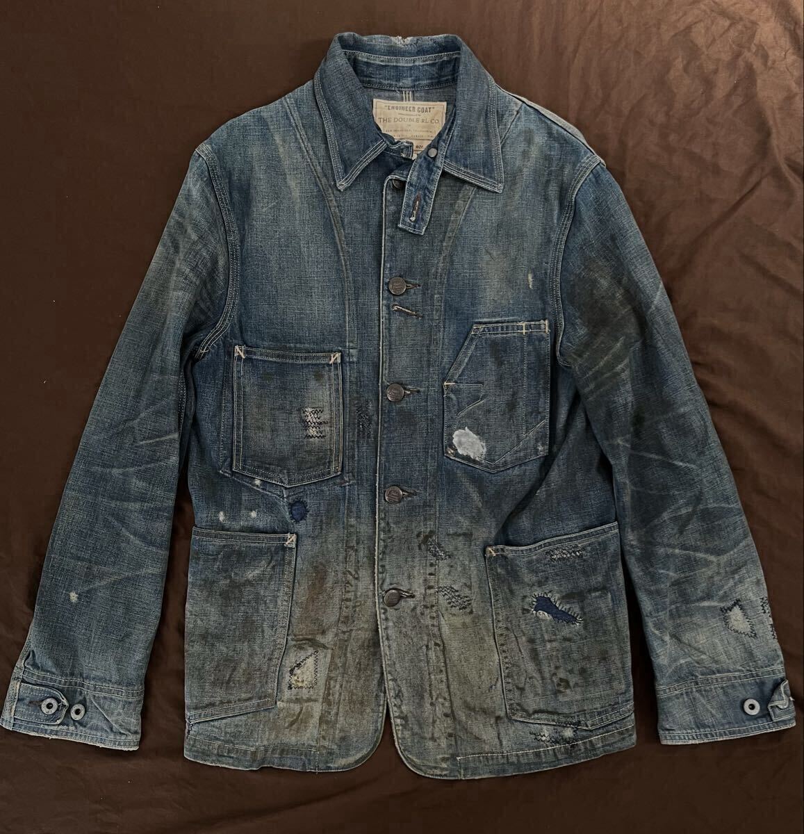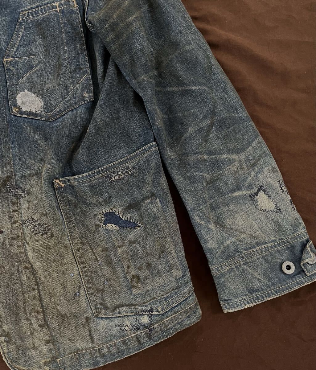 インディゴファンには堪らないイントネーション抜群のデニム地を使用し、数々のリペアや異デニムの当て布、油滴や補強跡に至るまで、あたかも当時物さながらのディティールは全てが個体ごとに異なる実質一点モノのもはや芸術品で、RRLの全アイテムの中でも屈指の加工群と最高の風合いを誇る生地感は見る者を圧倒します。