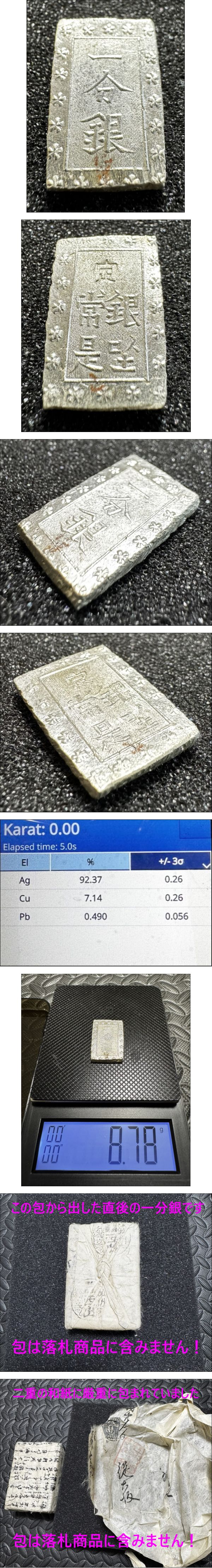 | 商品説明 | 【商品内容】 希少 【本座 安政一分銀 Ad 】 包出し ほぼ流通の痕跡が見られず、地肌の光沢や文字の切立ちも、とてもキレイです。 和紙の包の中に、さらに和紙で2重に厳重に包まれており 保存状態が非常に良い一分銀です。(写真に掲載) 個人的な感覚にはなりますが、 鑑定に出したら、MS鑑定つくんじゃないかなぁと思っています。 【品位】 銀92.37% OLYMPUS VANTA 蛍光X線分析計機 (約400万円)で測定。 鑑定結果は写真に掲載しています。 【量目】:8.78g 【状態】: 銀座オークションにて落札した一分銀、包出しです。 一分銀の包を開封した中の品物です。 画像にある包の中から出しました。 包は落札商品に含みません! 【本座 安政一分銀 Ad 】となります。 コンディションは写真でご判断ください。 現状で気に入っていただける方のみお願い致します。 計量器は安価な物ですので多少の誤差はあると思います。 発送は【おてがる配送ゆうパケットポスト】を選んでいただき コインホルダーに入れ、プチプチに包み さらにプチプチ付き封筒に入れて発送いたします。 ◆あくまで個人保管品です。 画像にてご判断いただき、ご納得いただける方のみご入札をお願い致します。 また画像には限りがございますので、色味が異なる場合などあるかもしれません。 詳細部分にこだわる方、完璧をお求めになる方、状態に神経質な方もご遠慮願います。 商品状態に関しては個人差がございます。 落札後の商品状態による返品や故障時の補償は一切お断りいたします。 (すり替え防止の為) ◆不要なトラブルを避けるため、3日以内のご決済、 速やかな受け取り連絡をお守り頂ける方のみとしております。 あらかじめご了承ください。 お守り頂けなかった場合、落札者都合キャンセルとさせていただきます。 以上、全てをご了解いただける方のみご入札をお願い致します。 ■新規の方及び、評価が低い方の入札は取り消させていただく場合がございます。 ■領収証の発行は対応しておりません。 |