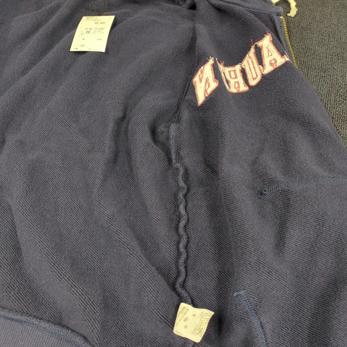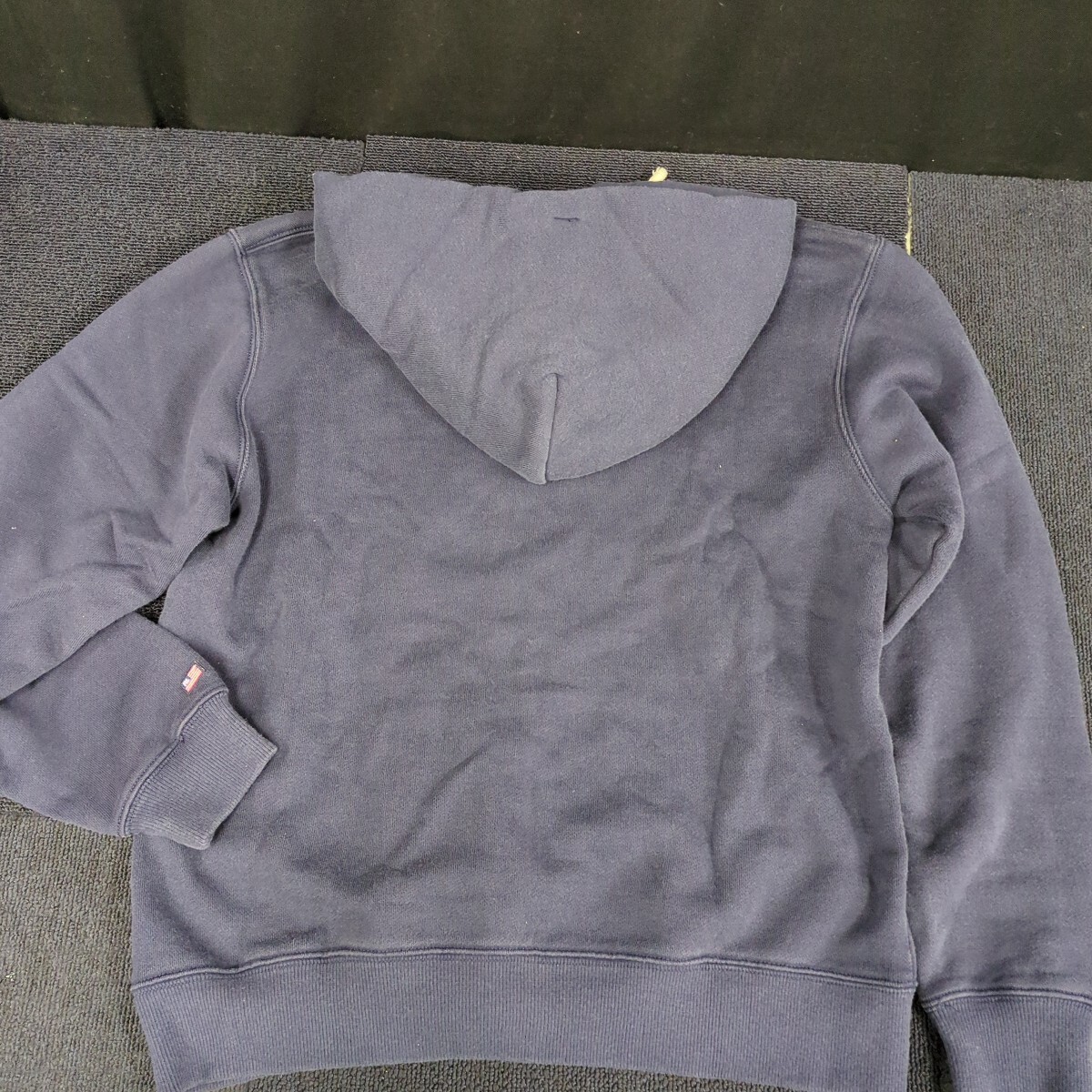 左袖下の方のミニロゴワッペン、フードや右ポケットから覗くタグがかわいく、おしゃれです