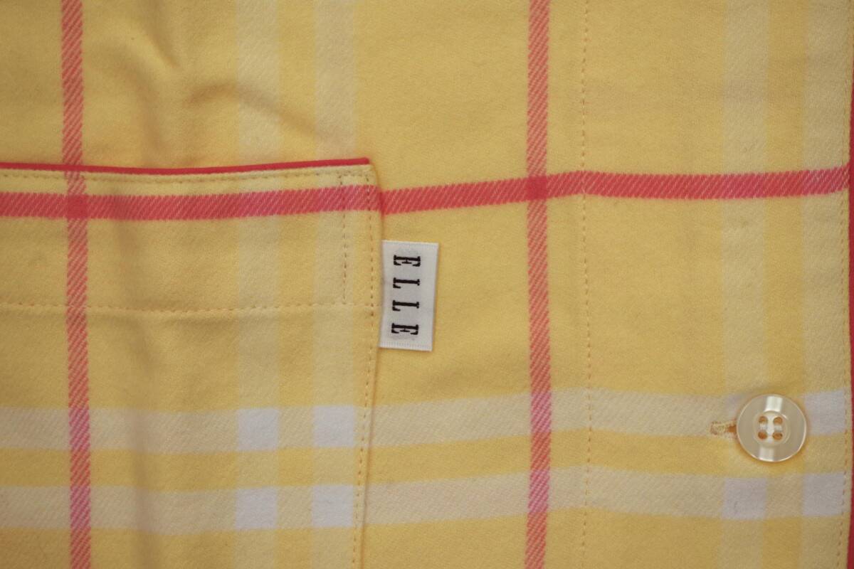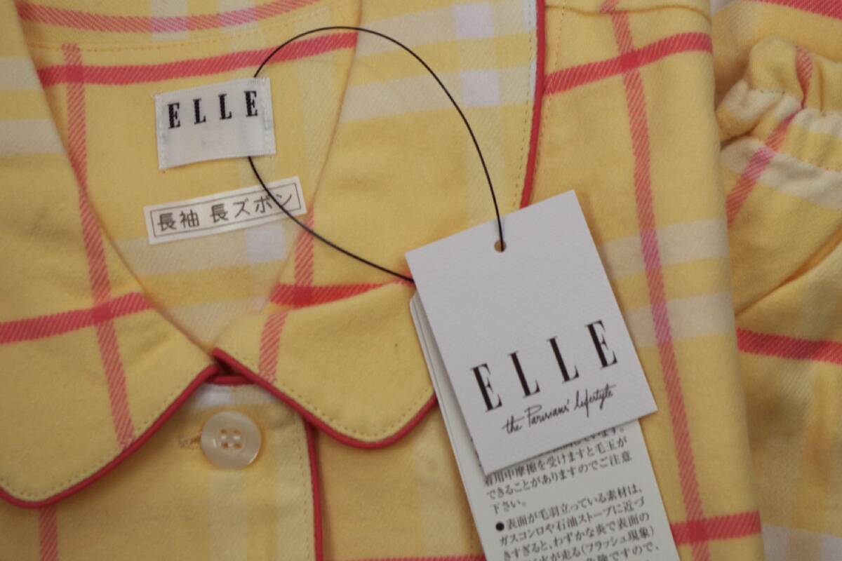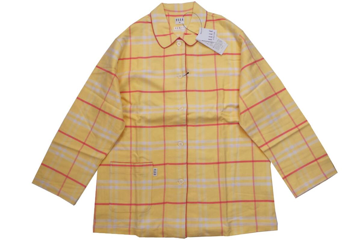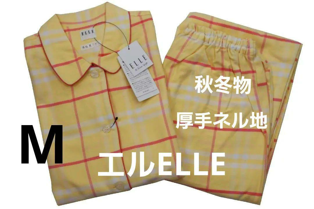●エルELLEの秋冬物厚手ネル地パジャマ、新品です。紙タグにシール跡があります。ご了承ください。前開き、長袖、ロングパンツ。色はイエロー系。 サイズMでバスト79-87㎝。素材は綿100%のネル地。正規ライセンス会社扱い品です。