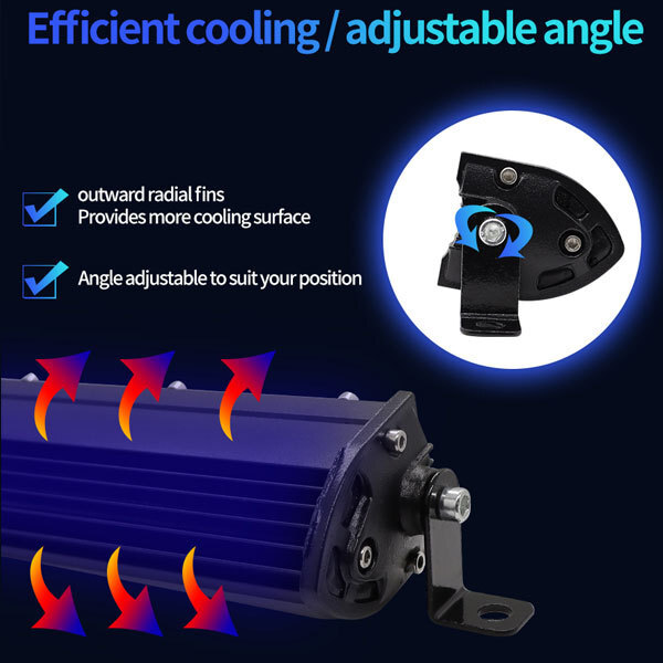 ....調整可能な取り付けブラケット:合理的な設計により、ライトバーがしっかりと固定され、衝撃やその他の振動条件に耐えることができます。取り付けブラケットは、ニーズに合わせて調整できます。ブラケットは180度の角度調整が可能で、作業灯は約45度に調整できるため、方向転換が容易です。