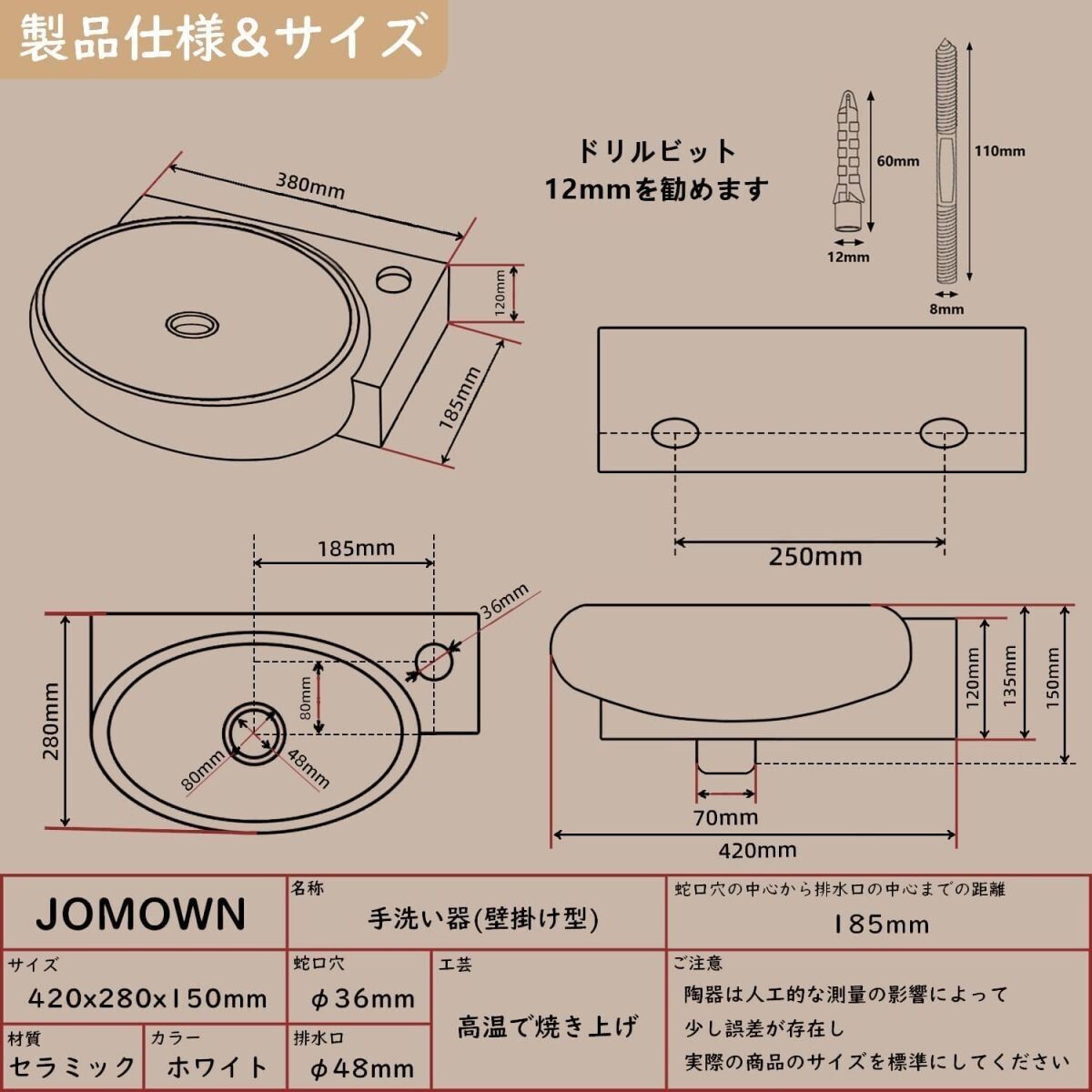 【規格&取り付け説明】:手洗い器サイズ:420*280*150mm、重さ:8kg、排水口径:45mm、蛇口の取り付け穴径:36mm、ドリルビットは12㎜を勧めます。