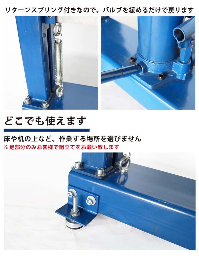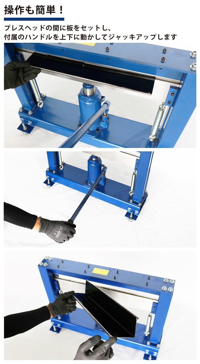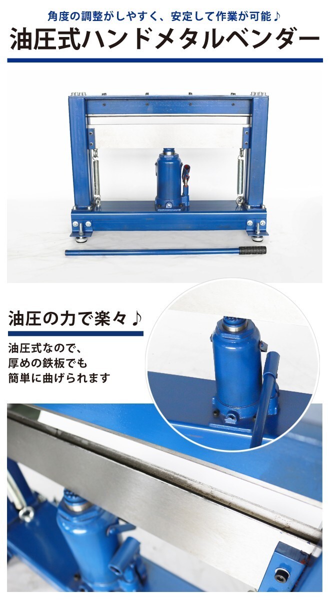●鉄板を曲げる事ができる、ハンドメタルベンダーです ●プレスヘッドの間に板をセットし、付属のハンドルを上下に動かしてジャッキアップします ●角度の調整がしやすく、安定して作業ができます ●リターンスプリング付きなので、バルブを緩めるだけで戻ります ●床や机の上など、どこでも使えるので、作業する場所を選びません ●足部分のみお客様で組立てをお願い致します |