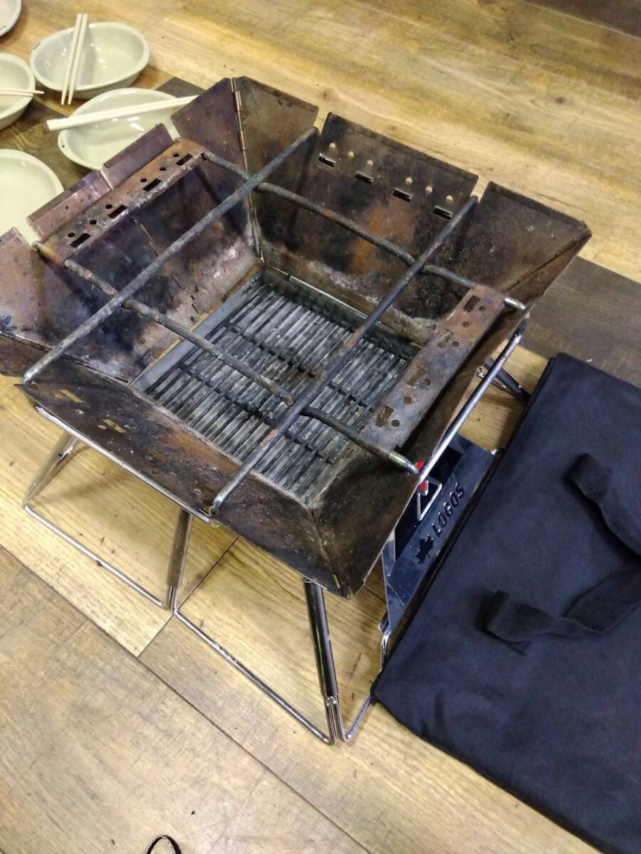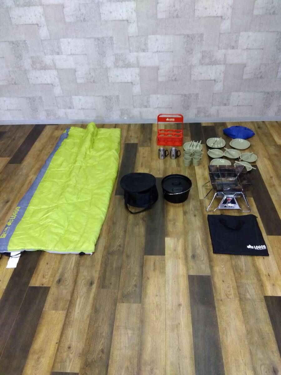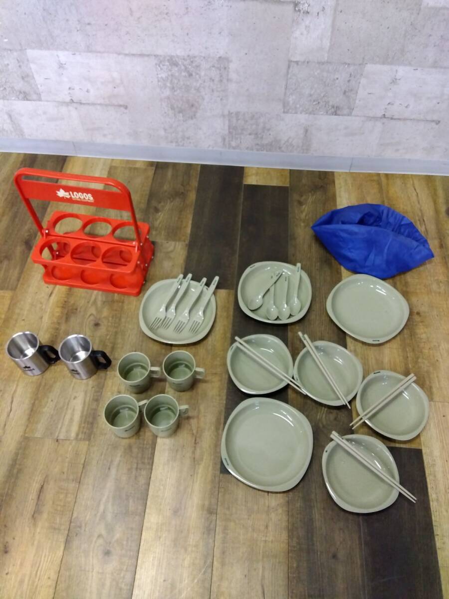 中古商品:焚き火台の使用感が大きくサビ付きがございます。食器セットは一部汚れ付きがございます。