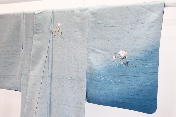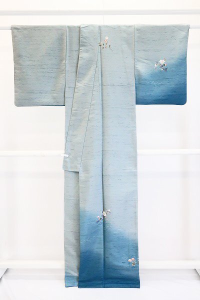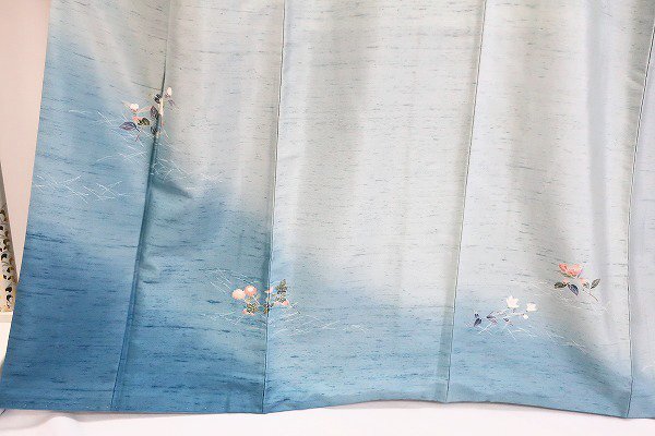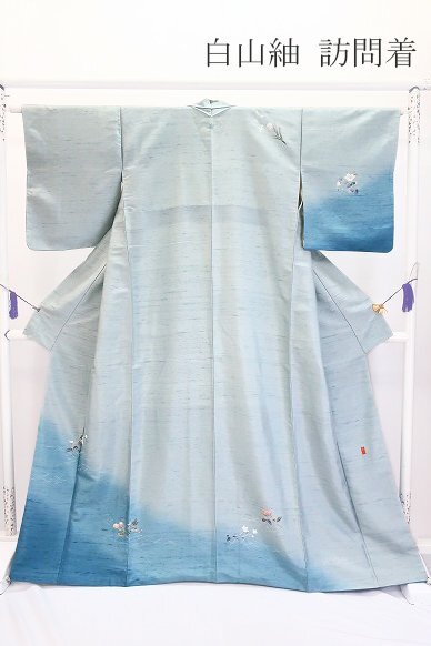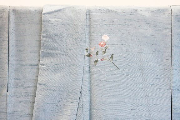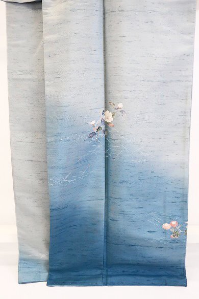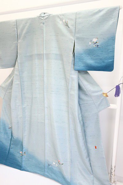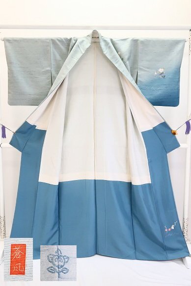 〔着物の色〕 薄い水色 〔八掛の色〕 薄い青(柄入り) 〔着物の素材〕 正絹 |