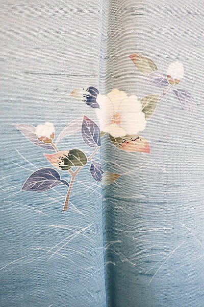 | 【送料無料】未使用品 訪問着 白山紬 薄い水色 枝花 椿 身丈163cm お洒落 カジュアル 着物 着物フィ 正絹 m-8312 |
