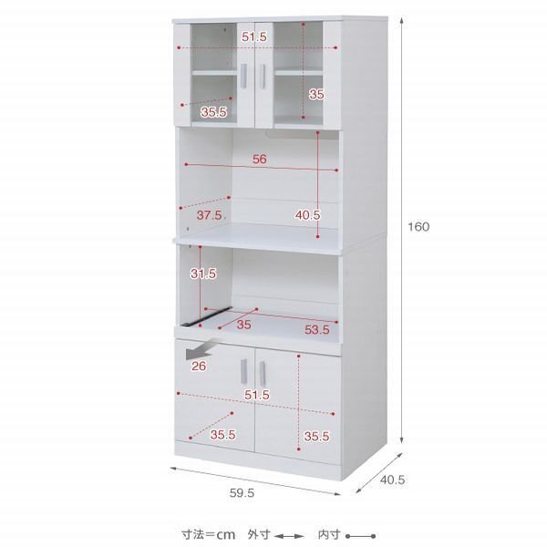 【カラー】 ホワイト 【サイズ】 <外寸> 幅59.5×奥行40.5×高さ160cm <内寸> 上部扉内:幅51.5×奥行35.5×高さ35cm 下部扉内:幅51.5×奥行35.5×高さ35.5cm オープン部:幅56×奥行37.5×高さ40.5cm スライド部:幅53.5×奥行35×高さ31.5cm スライド引き幅:26cm 可動棚:幅56×奥行35×厚み1.5cm(3.2cmピッチ3穴) 【材質】 本体:プリント紙化粧合板 オープン部:合成樹脂化粧合板(塩化ビニル樹脂) スライド部:合成樹脂化粧パーティクルボード(塩化ビニル樹脂) 【生産国】 マレーシア 【梱包】 2梱包でお届けします。 (2-1) サイズ:86.5×43.5×18cm、重量:24kg (2-2) サイズ:85×43×11.5cm、重量:16kg 【耐荷重】 可動棚/スライド棚:(約)5kg以下 天板:(約)7kg以下 【その他】 ・2口コンセント(合計1500W)/コード長さ180cm ・可動棚:2枚 【組み立て品】 お客様による組み立てが必要です。 |