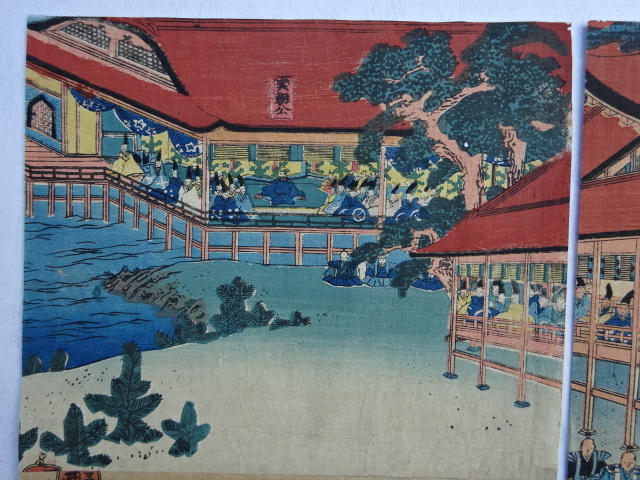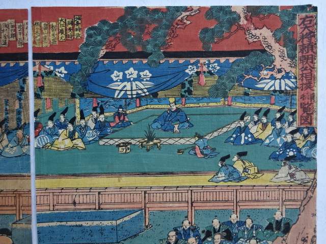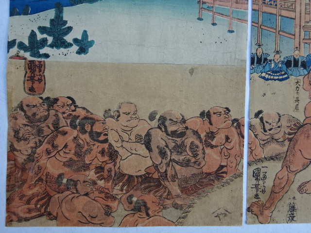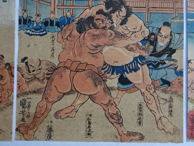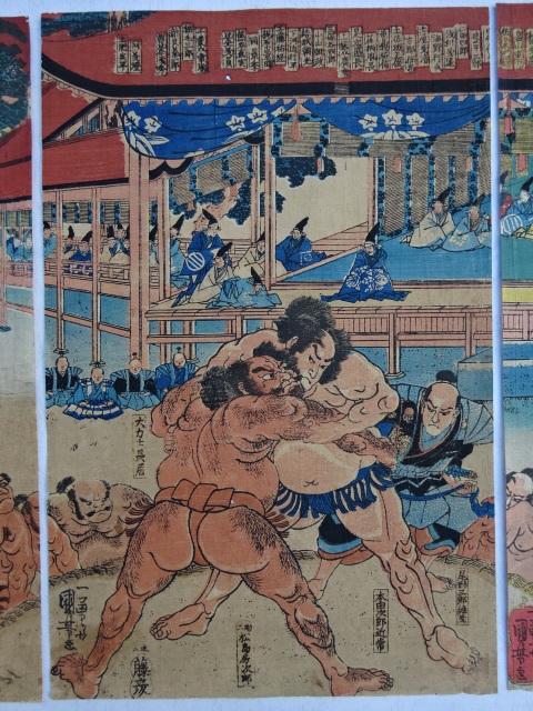 博物館所蔵 浮世絵師 歌川国芳 版画 一勇齋國芳画 版元 藤岡屋彦太郎『 右大将頼朝公相撲御覧図 』真作 本物保証 浮世絵 3枚続 レア!