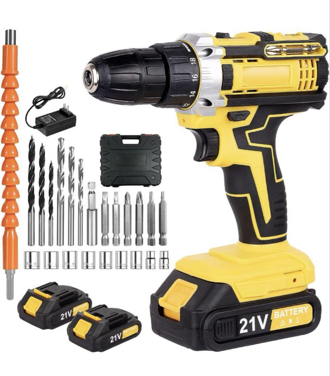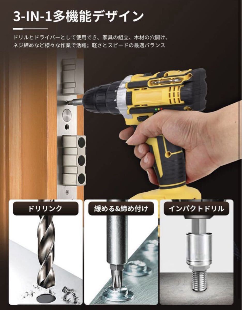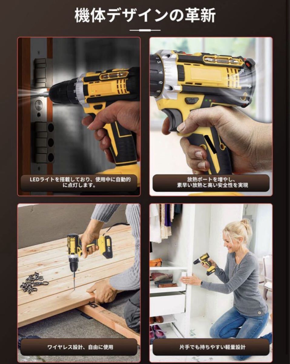 【21V高性能・コードレス電動ドライバーセット】電動ドリル、ドライバー、ネジ締めの3役をこなす多機能設計で、家具の組み立てや木材の穴開けなど幅広い作業に対応し、コードレス仕様に加え1.5Ahの大容量バッテリーを2個搭載しているため、電源がない場所でも長時間の連続作業が可能で、わずか1.2kg(バッテリー付き)の軽量設計により片手でも扱いやすく、女性でもDIY作業が快適に行えます。
