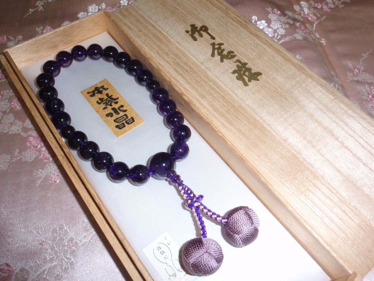 ◇25◇ 天然紫水晶共仕立 22玉 片手数珠 釈迦凡天房 国産品 桐箱入り 念珠 新品未使用【信頼のヤフオク!実績25年】☆