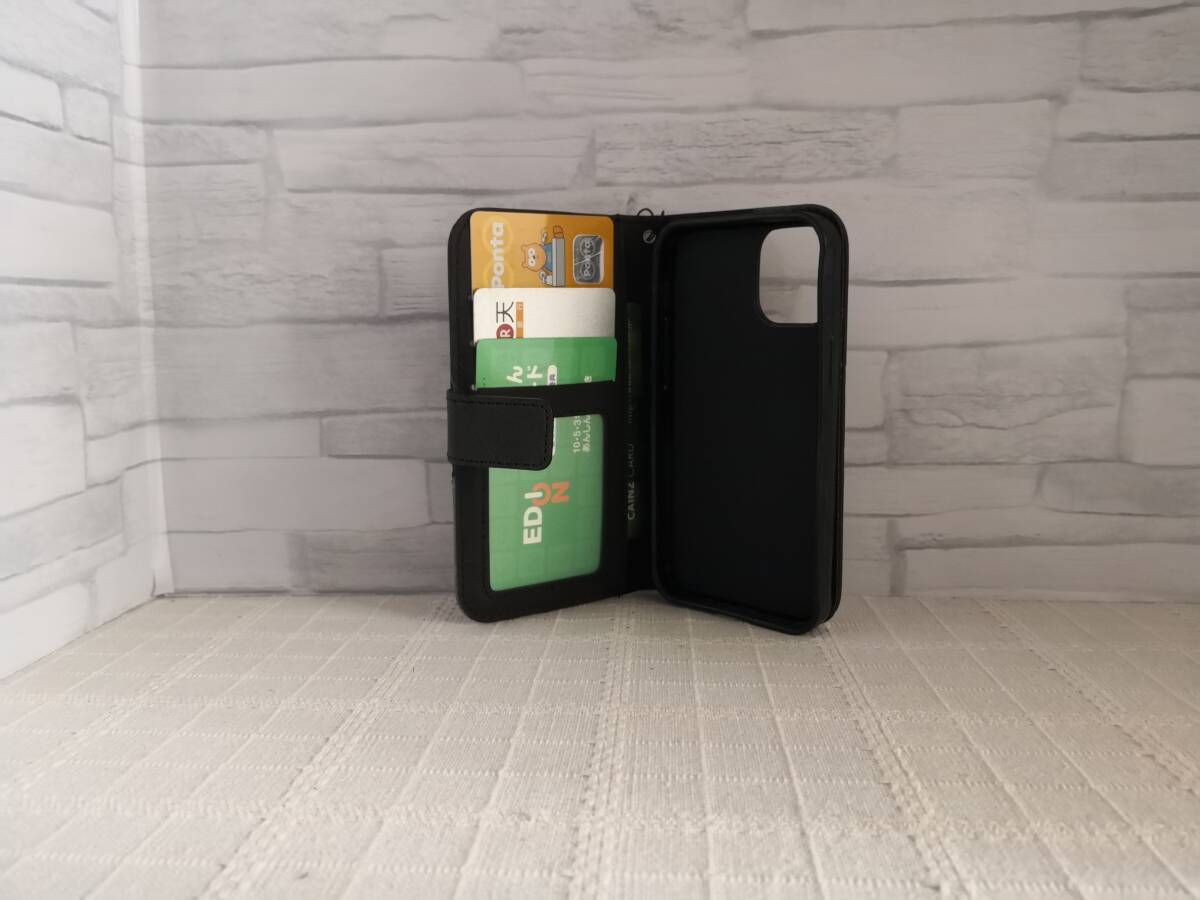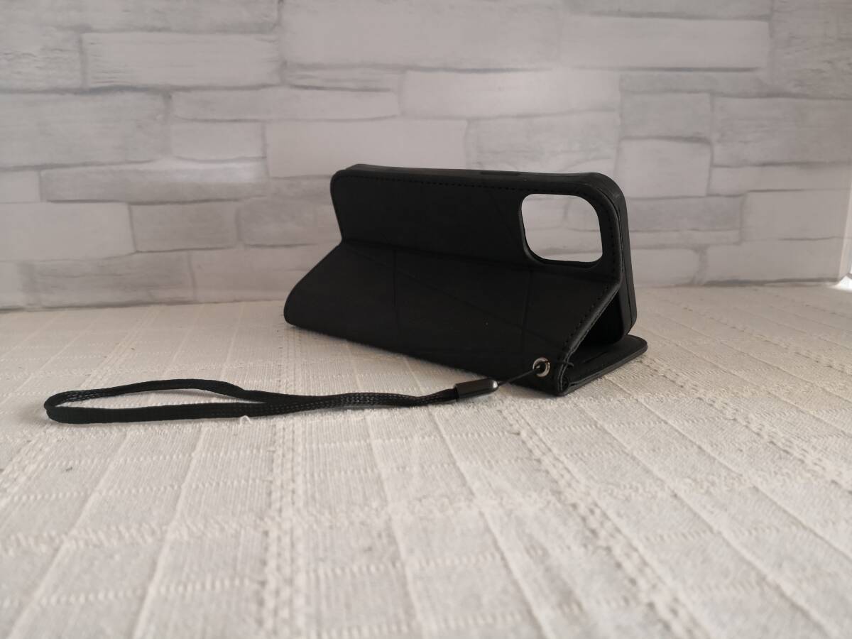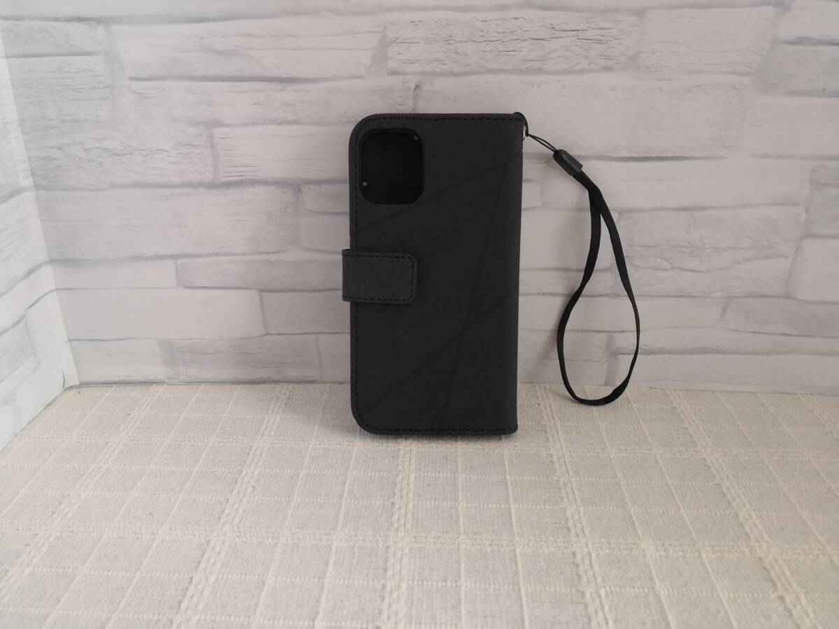 iPhone 12 mini ブラック 手帳型 レザー ケース カード,写真入&内ポケット ストラップ付 (格子柄)