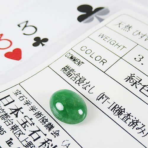 品名 /【SJ】新品 ヒスイ(ジェイダイト)3.35ct ジュエリールース 材質 / 天然ヒスイ(ジェイダイト) 縦・横 / (約)10.6mm 8.1mm 厚さ / (約)4.6mm 総重量 / 3.35ct 日宝協ソーティング付き 【SJ】/ 新品製品 品番 / ACD565 参考小売価格 / 154,000円 |