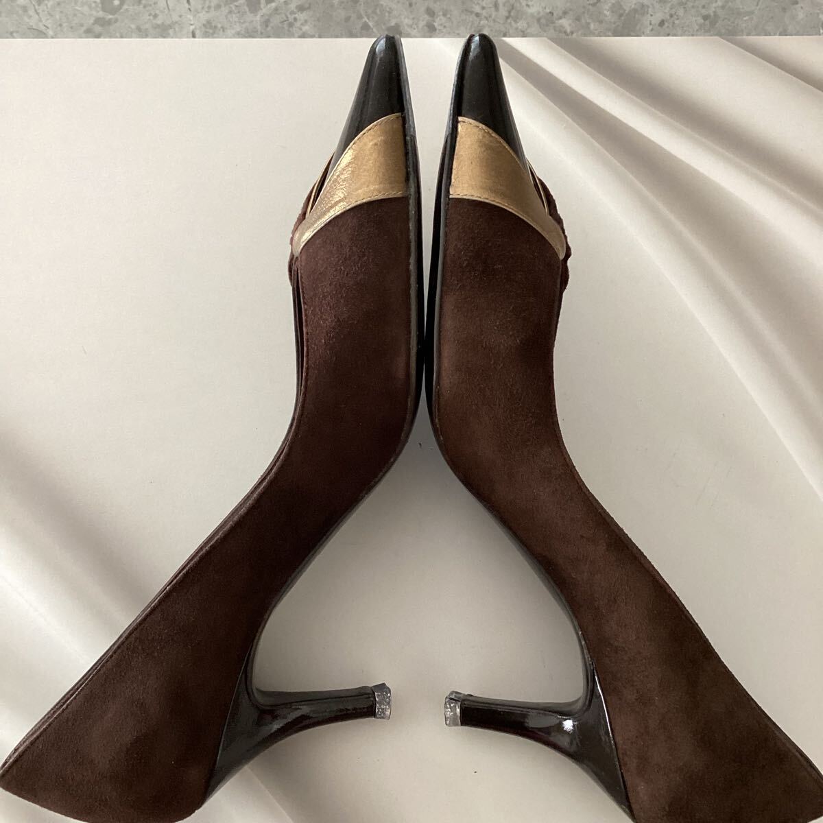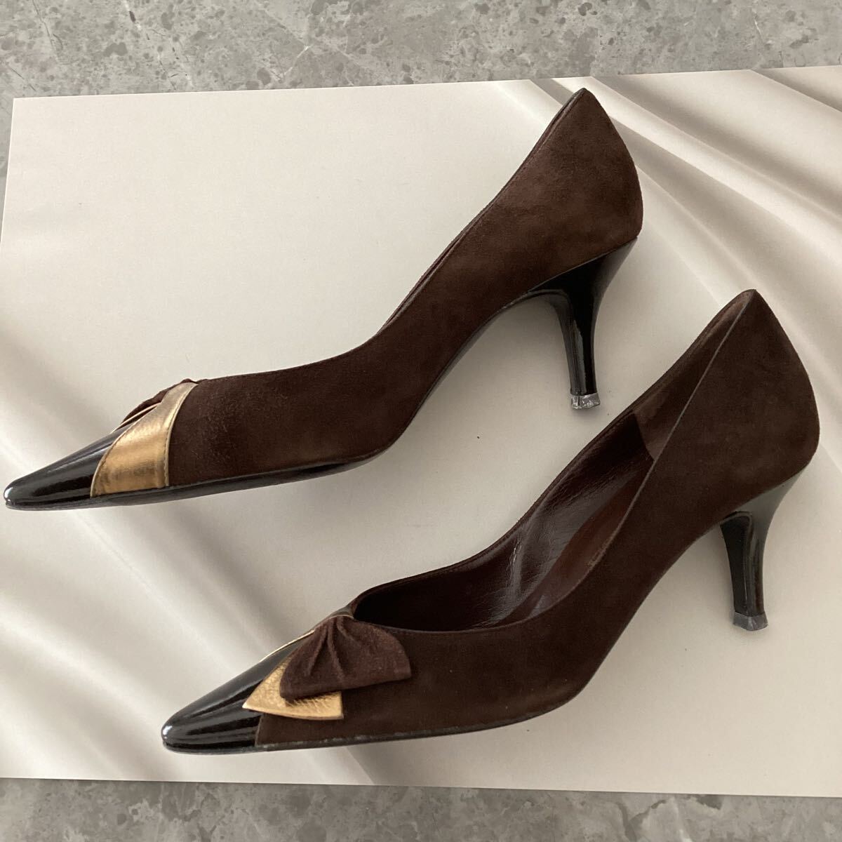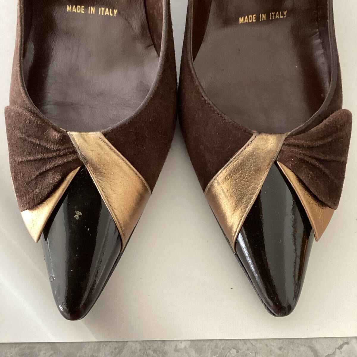 ブラウンスエードとブラックレザーのコンビネーションが特徴的なポインテッドトゥパンプス。