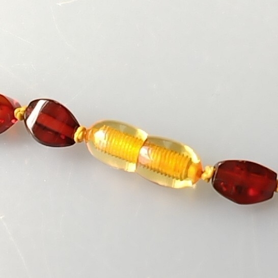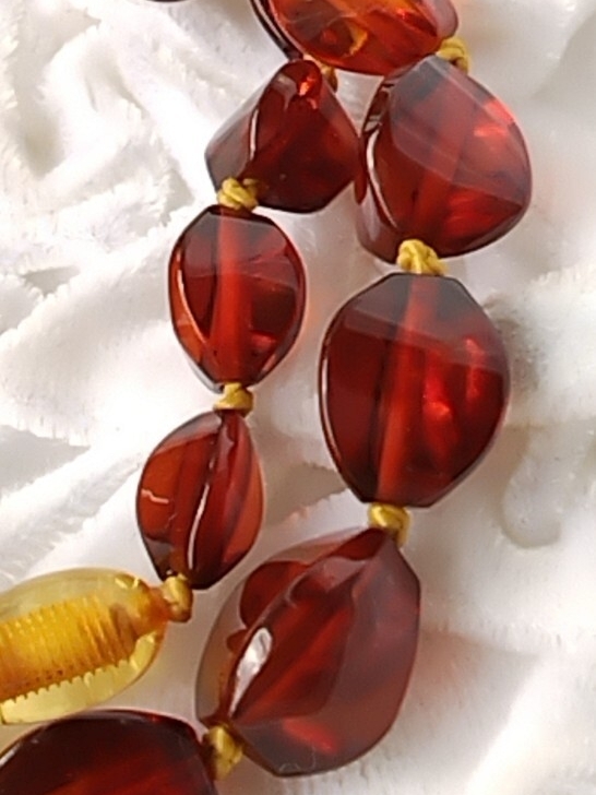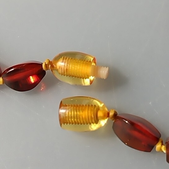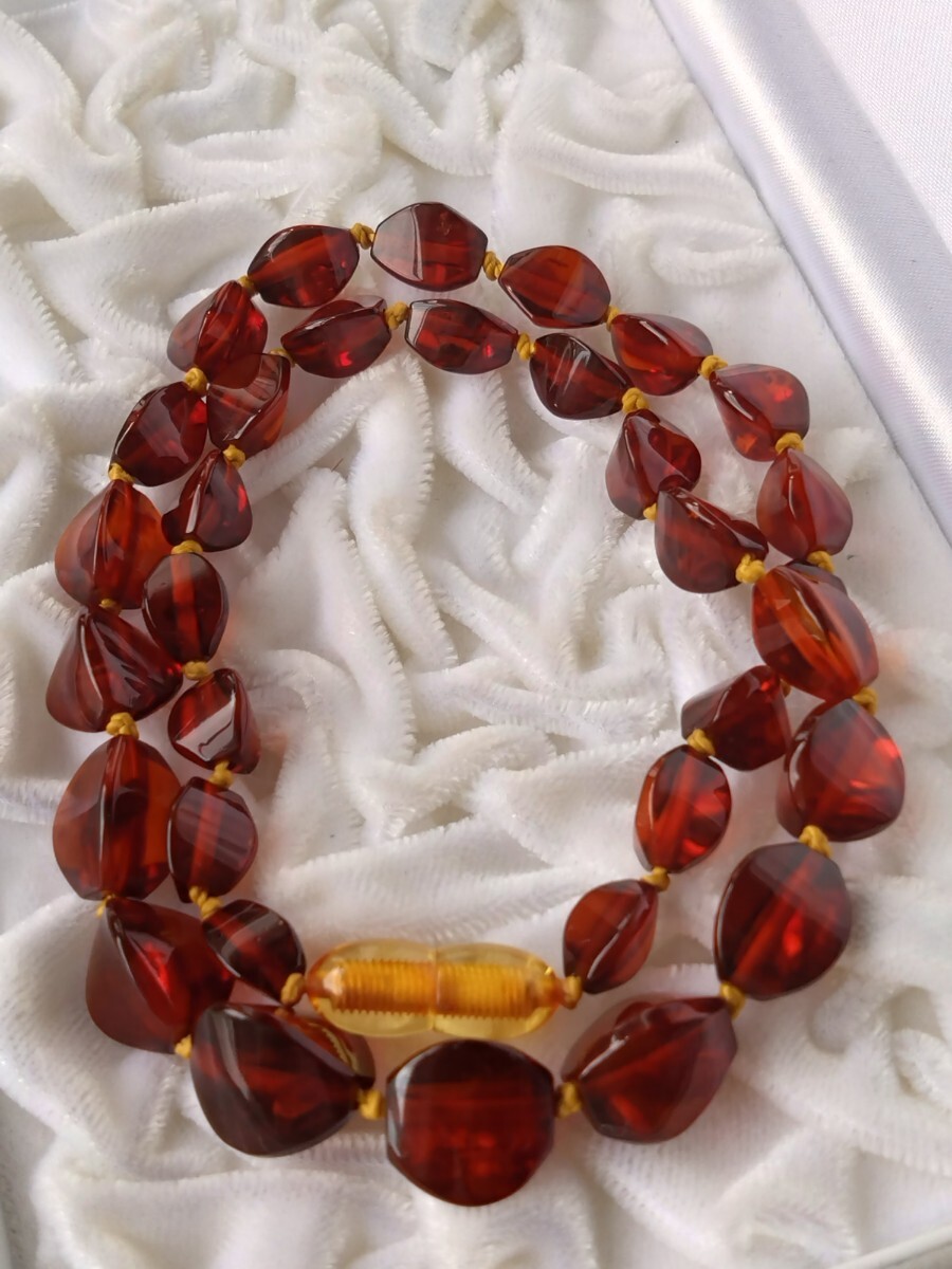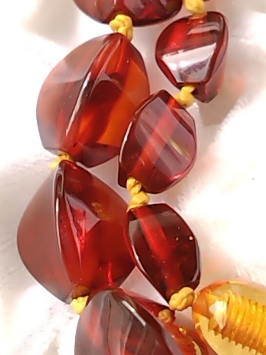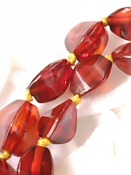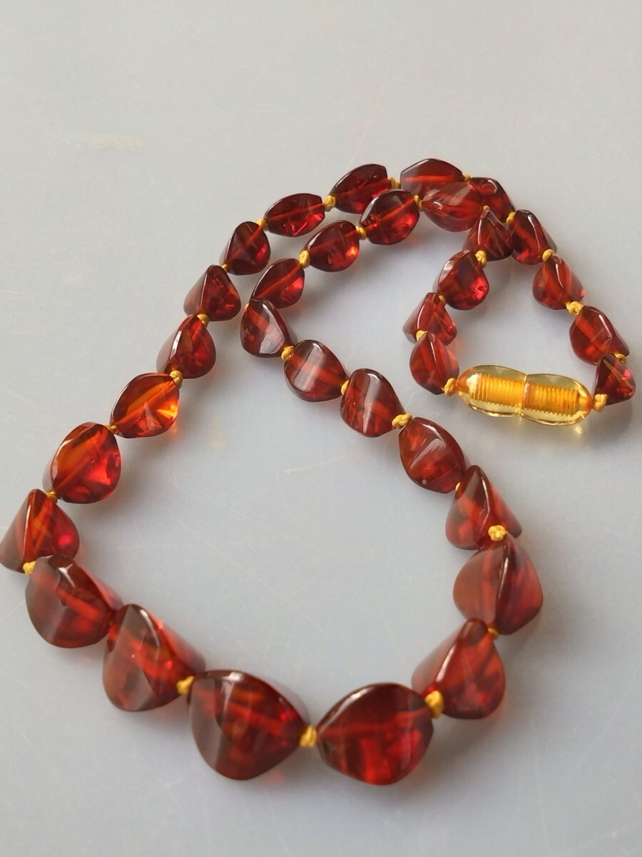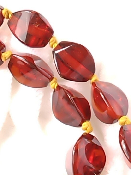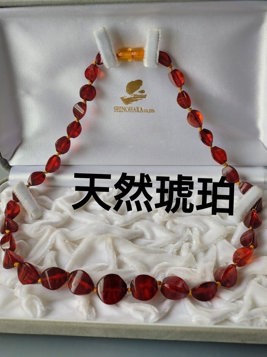 光沢のある深いティーブラウン、レッドアンバーに近い色合いの天然琥珀ネックレスです。美しくシェイプされた琥珀は一玉一玉手結びオールノット加工が施された大変丁寧な造りです。 長さ約50センチ
