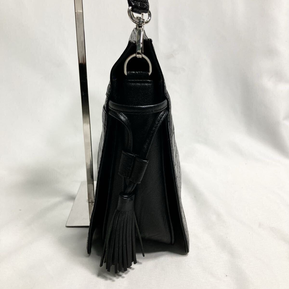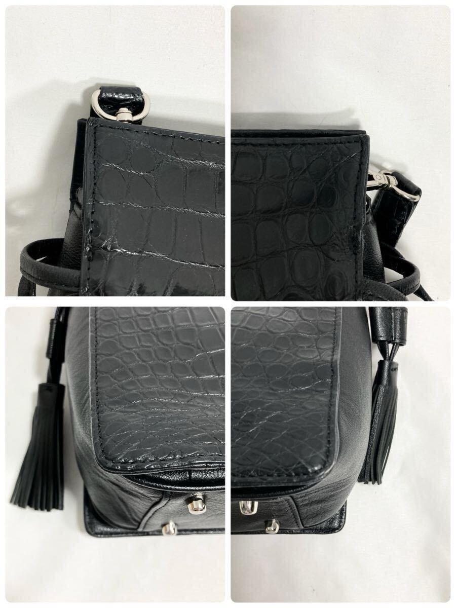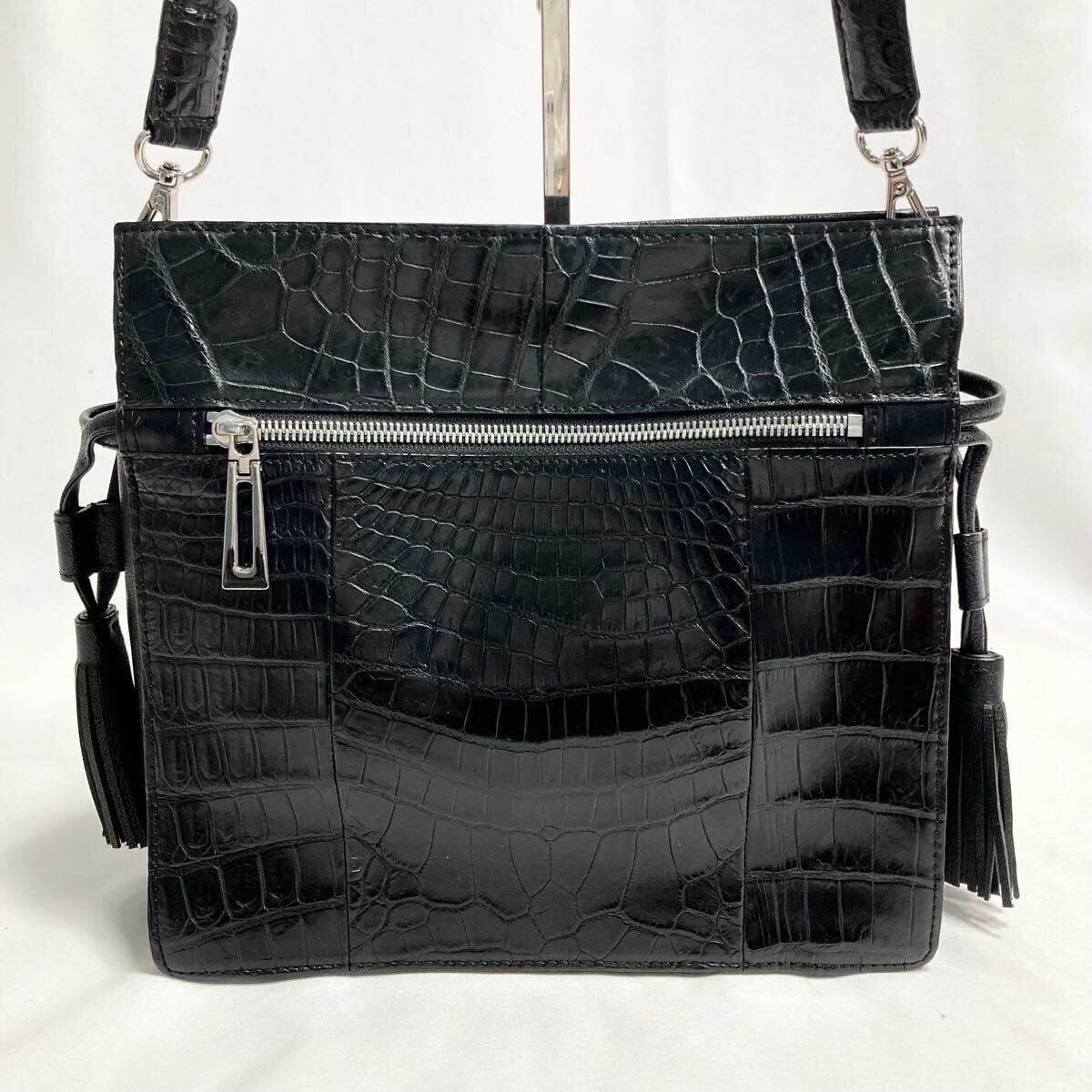 1円 極上品 ハンドバッグ ショルダーバッグ クロコダイル クロコ マットクロコ センター取り タッセル フリンジ 編み込み ブラック 大容量