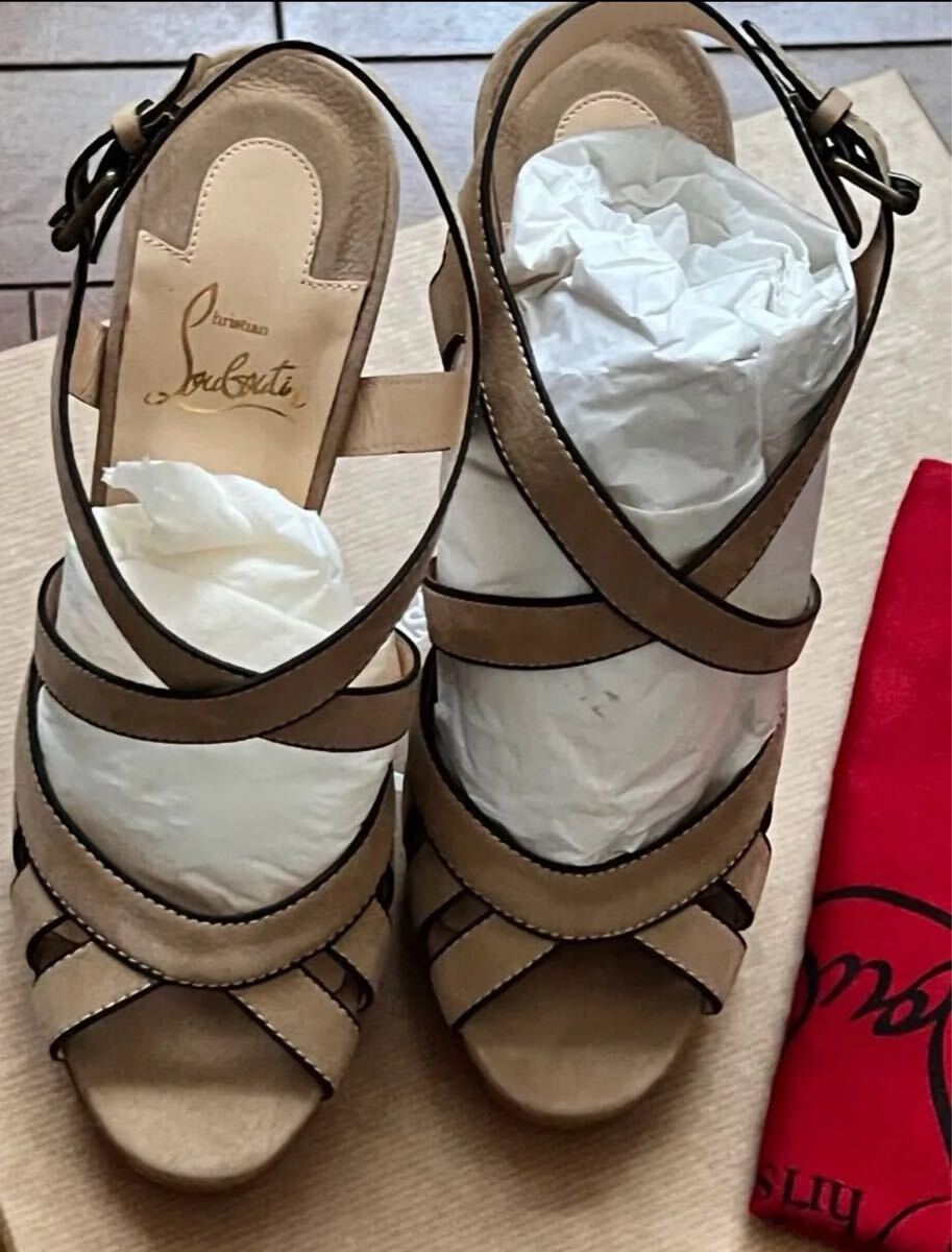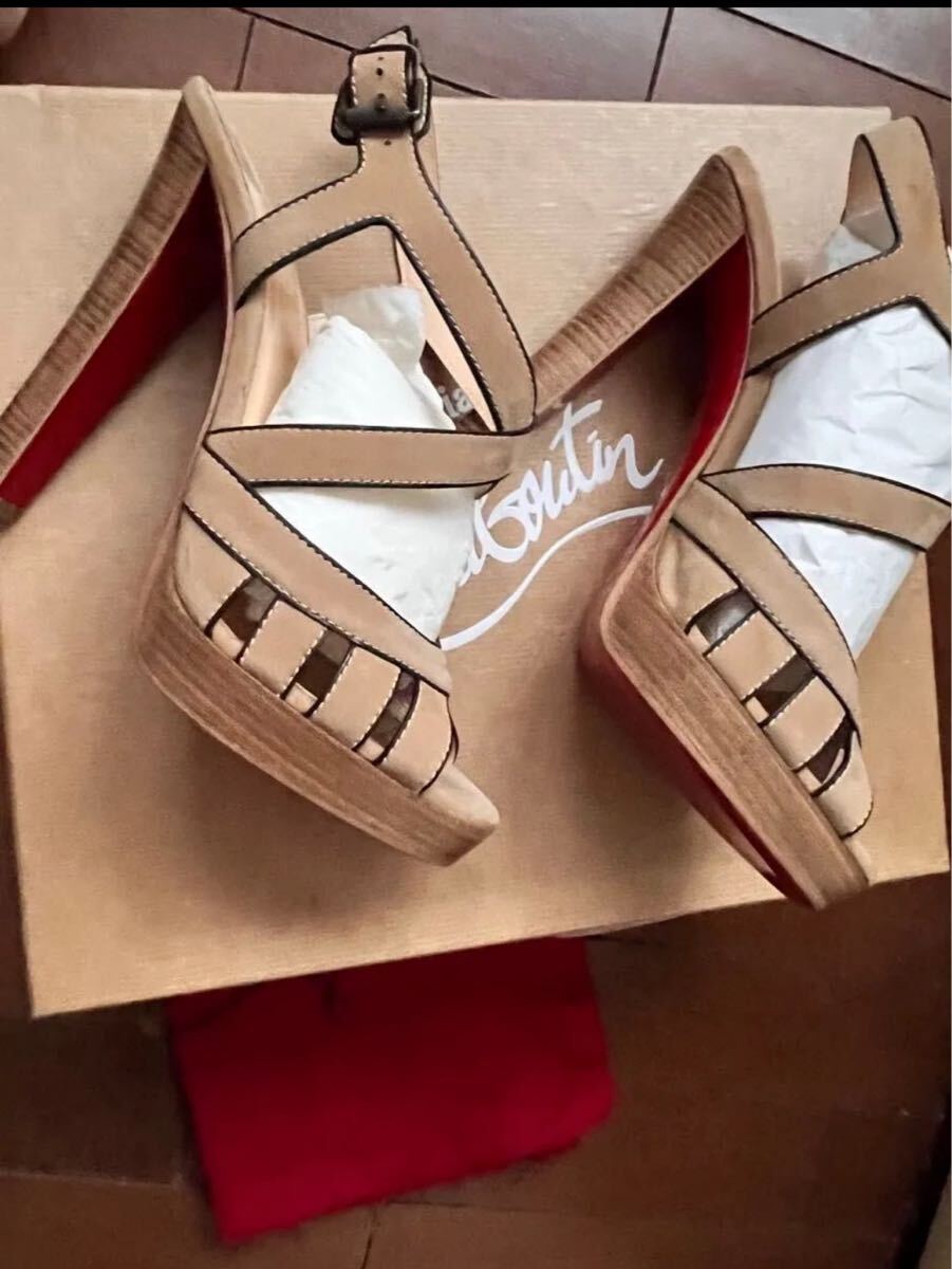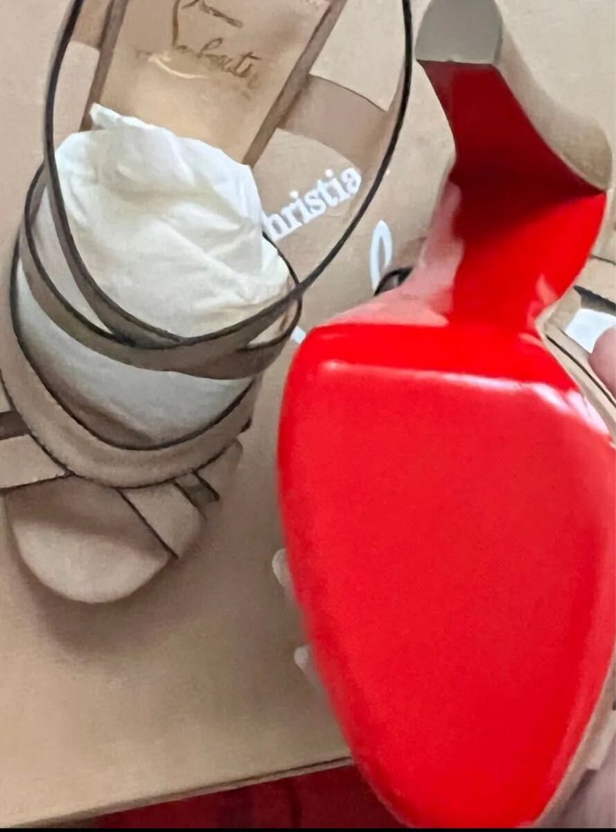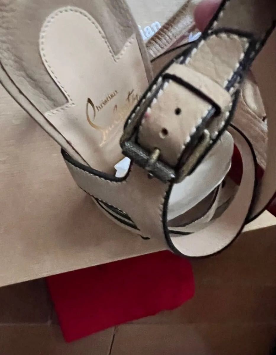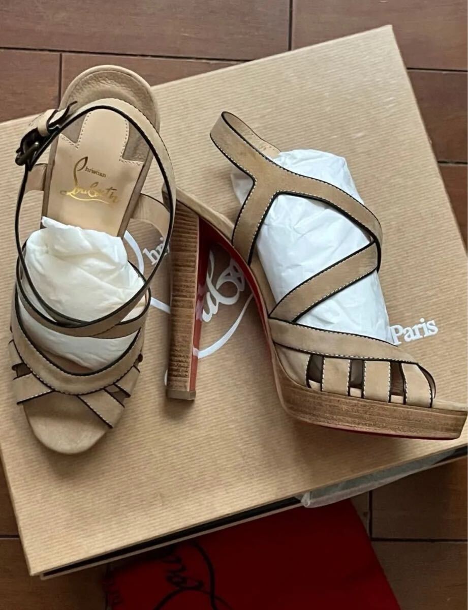 クリスチャンルブタンのハイヒールサンダルになります。ストラップがとても繊細な曲線でとても綺麗なデザインです。ベージュなので合わせやすいかと思います。購入したまま保管してましたので、箱にややダメージあり。保存袋入ってました。表記は目安にしてください。サイズ感に関してはルブタンは少し個人的に違うので質問にはお応えできかねます。宅配用ビニール袋に入れてヤマト運輸にて発送いたします。箱上に緩衝材はいたしません。