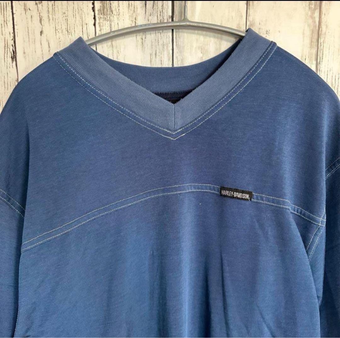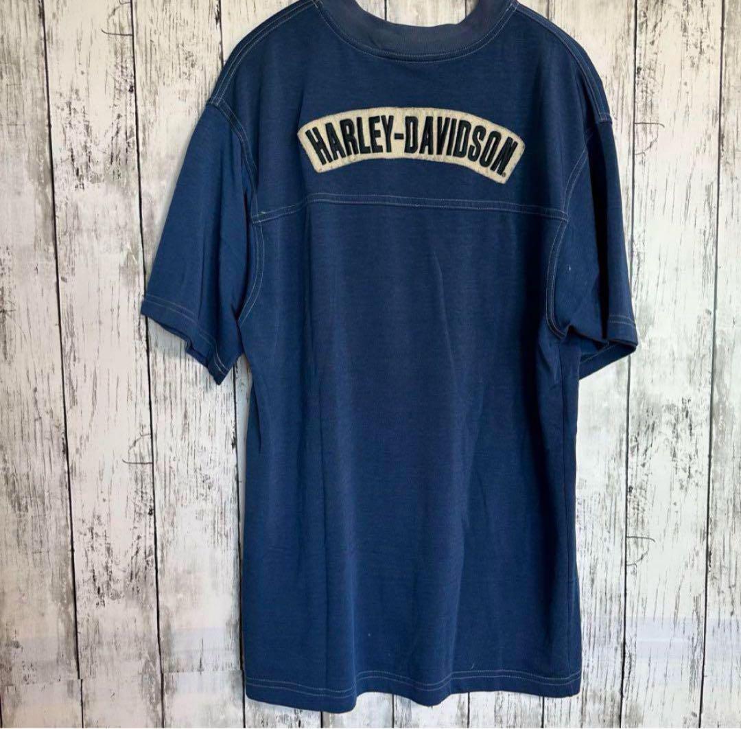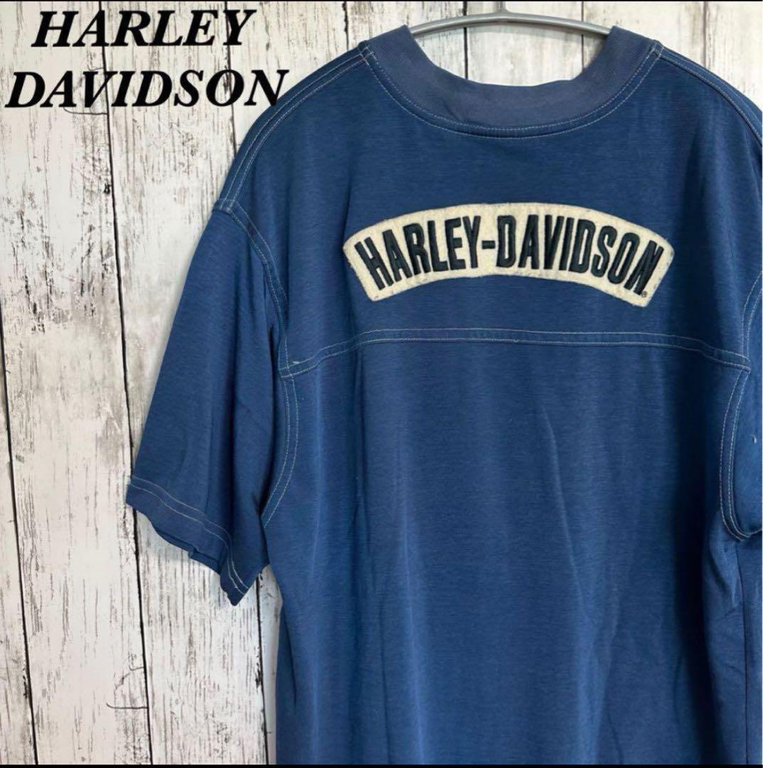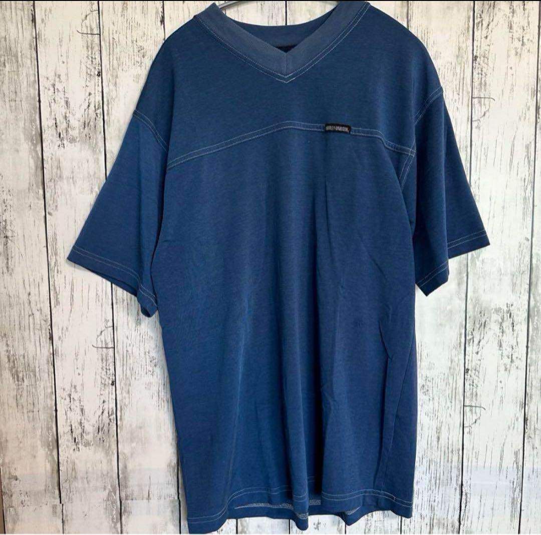 【希少】ハーレーダビッドソン Harley Davidson メンズ 半袖 Tシャツ Mサイズ ネイビー Vネック 青 ワッペンロゴ ヴィンテージ 古着