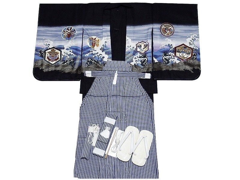 ■七五三 男の子用■男児 アンサンブル 着物 &袴 フルセット 黒地 鷹 着丈105cm 5h-127 【アンサンブル& 袴 の豪華なセット!】