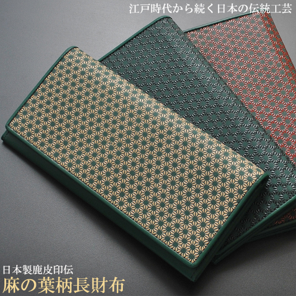 【1点限り赤字超特価】【送料込み】【期間限定】【新品】【税込み】鹿革漆付け加工 麻の葉模様柄 印伝 男女兼用 ロングウォレット 3色