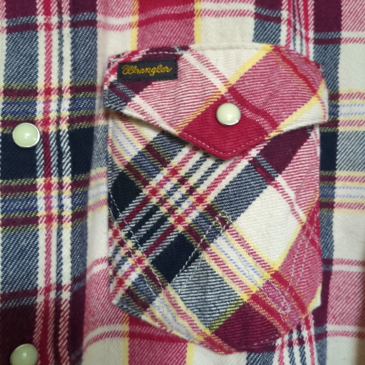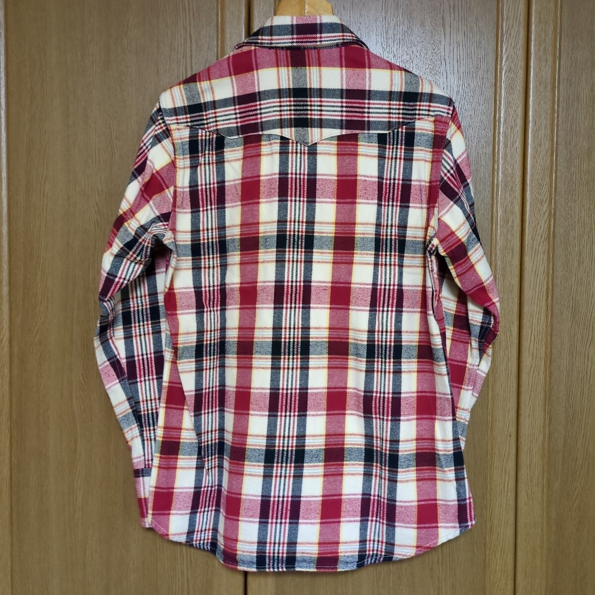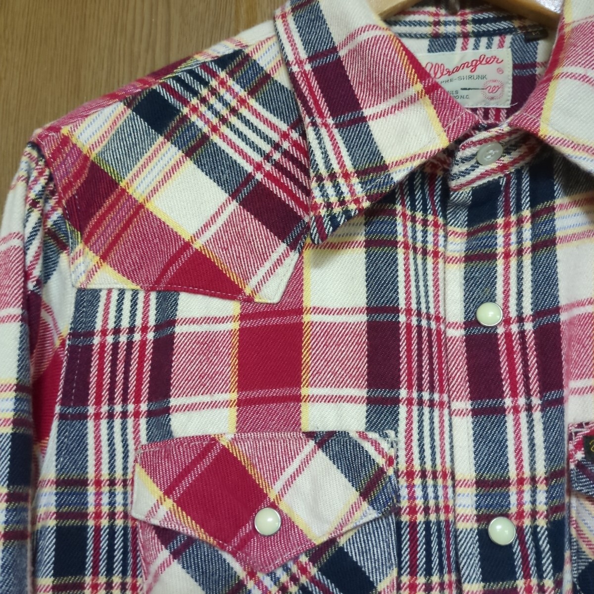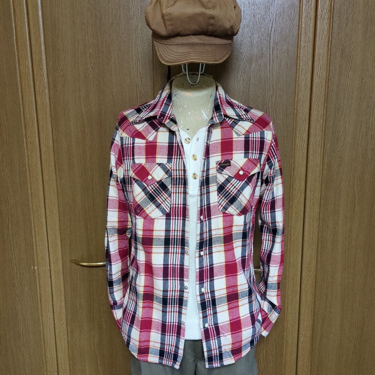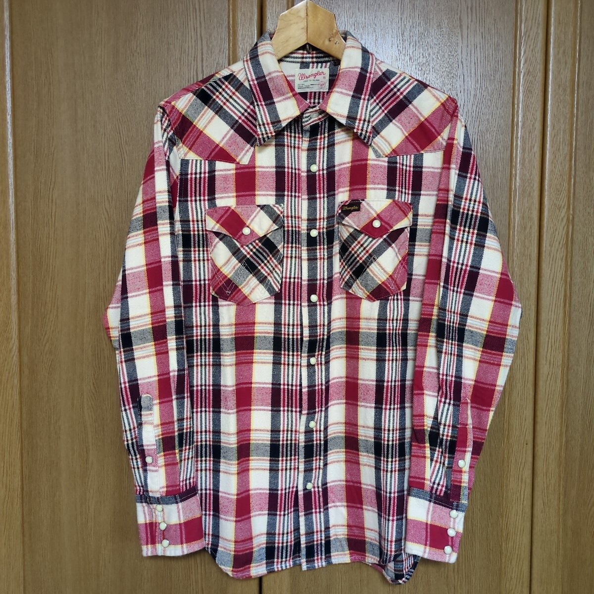 ラングラーの赤紺白系チェック柄のネルシャツ(ウエスタンシャツ)です。若干の使用感ございますが、特に大きなダメージも無く(チェックしまして生地、スナップボタン等に不備はございませんでしたが、USED品ですので見落とし、ボタンとれがあるかもしれません。USED品ですので、責任は持てません。リペア、ボタン交換等は落札者様でしてください。)、まだまだ着用して頂けるかと思います。あくまでUSED品になりますので、神経質な方、古着のご理解のない方、入札しないで下さい。メーカーサイズ表記Mサイズで、平置き採寸で、肩幅42,5センチ、袖丈60センチ、着丈72センチ、脇下身幅52センチです。素人採寸ですので多少の誤差はお許しください。