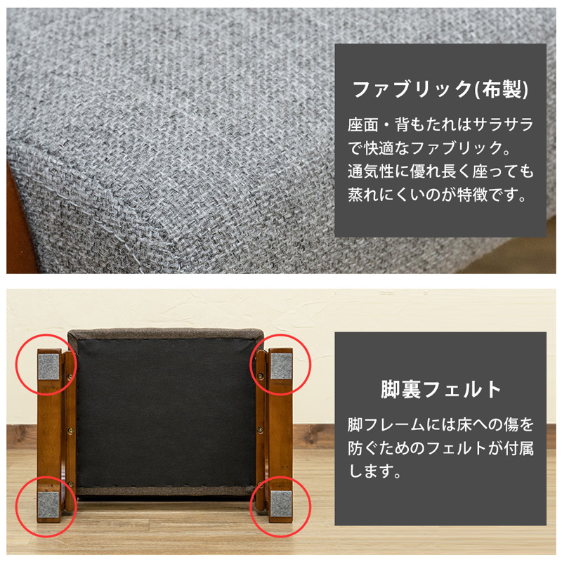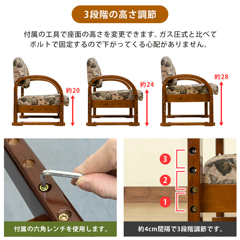 | 商品説明 | 組立品(15分) コンパクトサイズで使いやすい!ひざや腰に負担が掛かりにくい肘付き座椅子 ちょい掛けや正座いすとしてもどうぞ! 小さくて持ち運びにも便利なミニ座椅子。 座面の高さを3段階で変えられるので正座やあぐらで過ごす際の補助としても便利です。 しっかりした肘掛があるので、ひざや腰に負担を掛けずに立ち座りがしやすくなっています。 座面はサラサラなファブリック(布製)なので、長く座っていても蒸れにくく過ごしやすいつくりです。 |