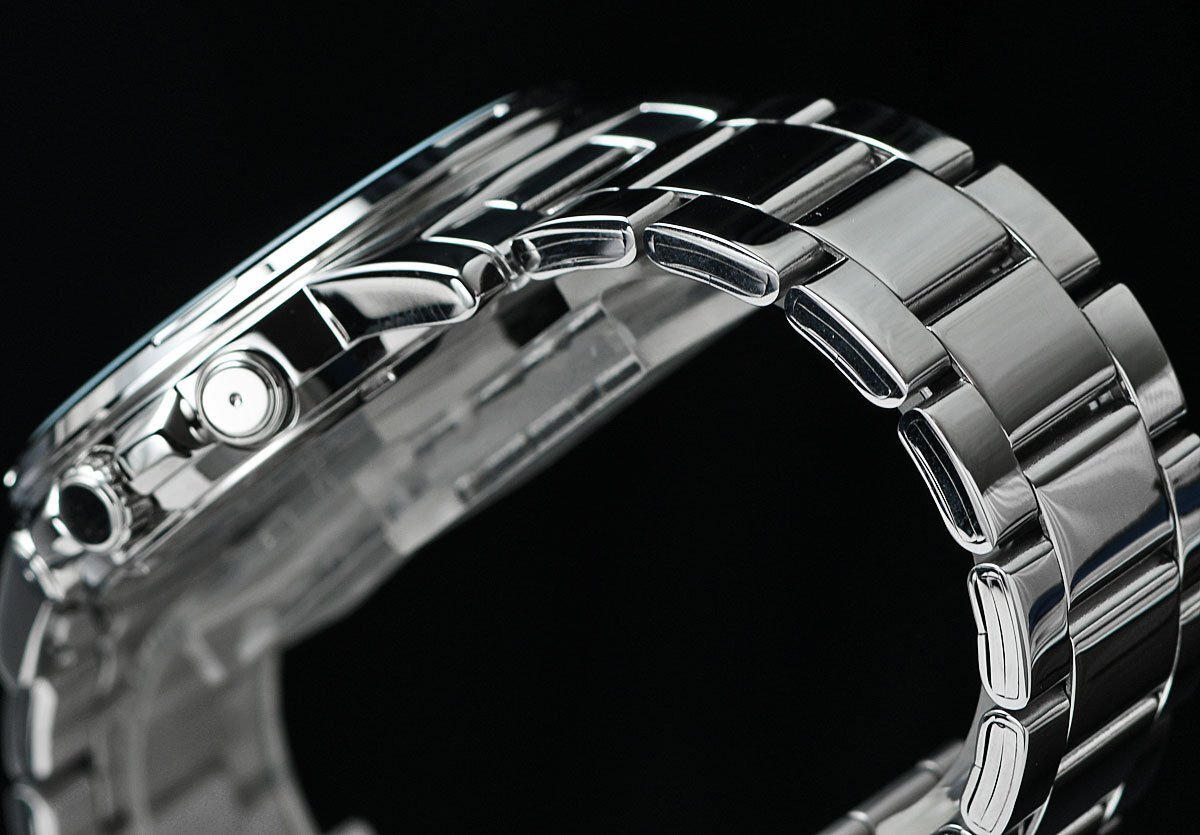 鮮やかなスカイブルーメタリックの文字盤が美しく視認性も高いデザインです。