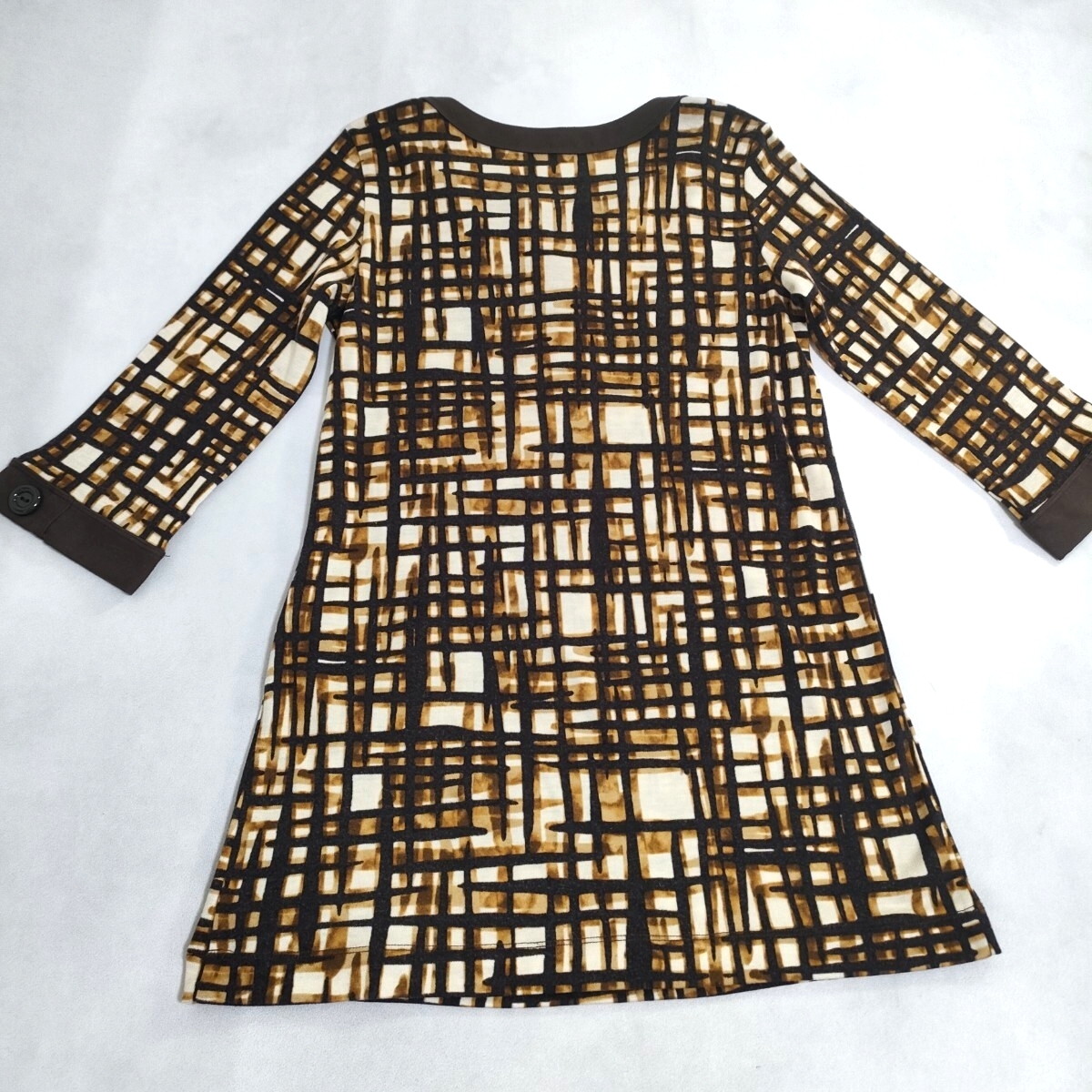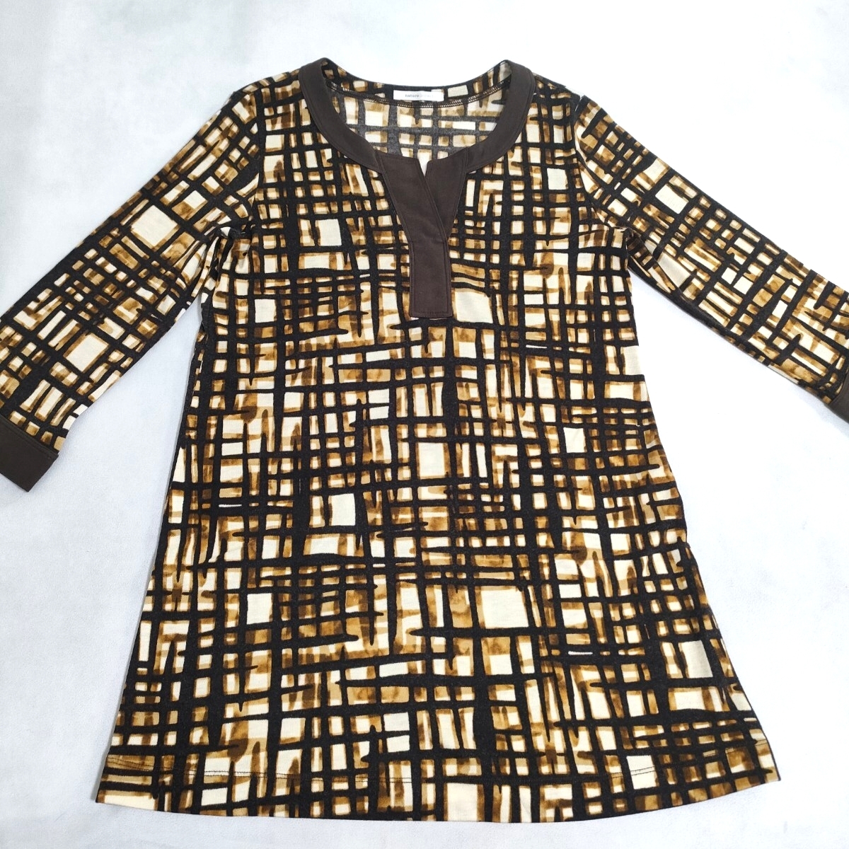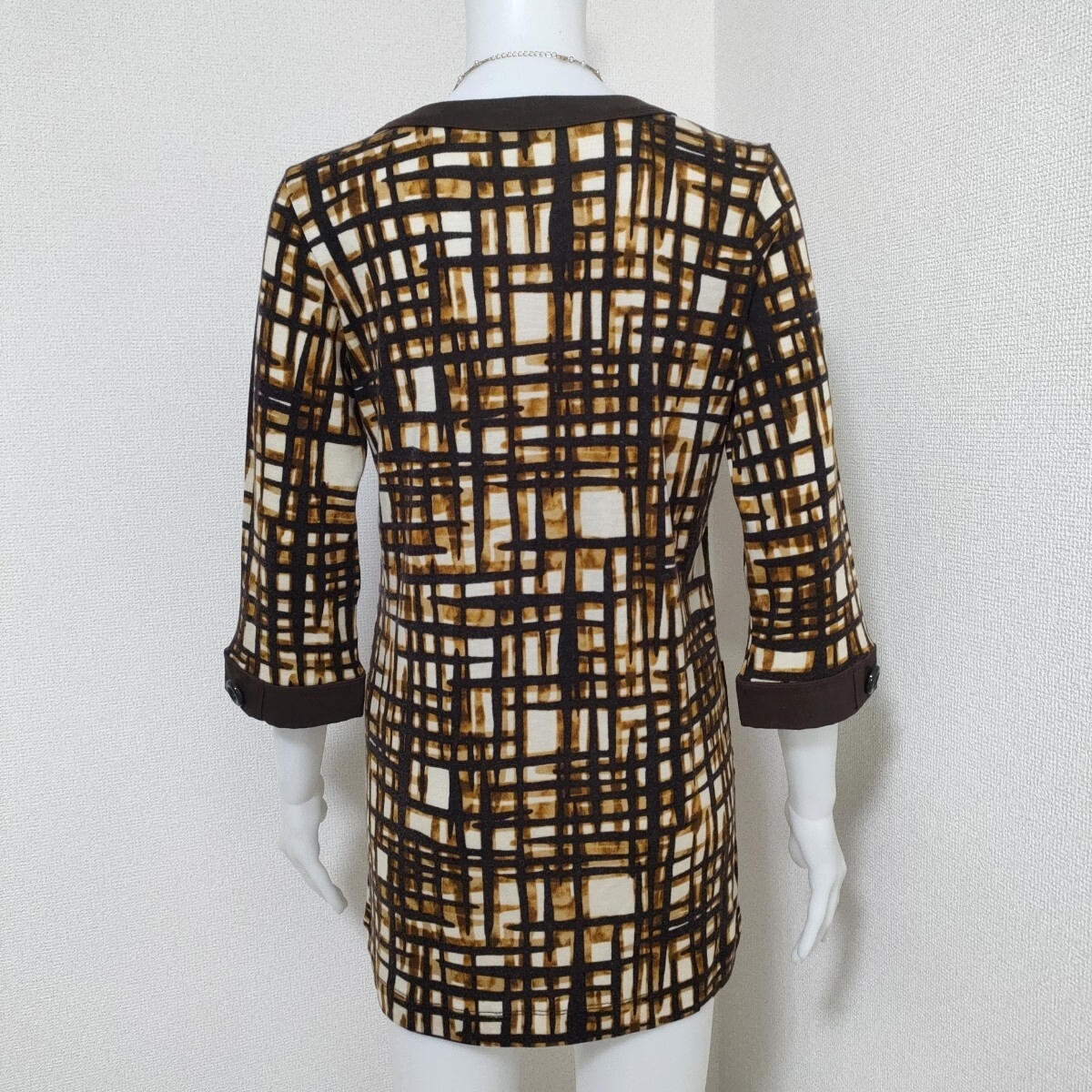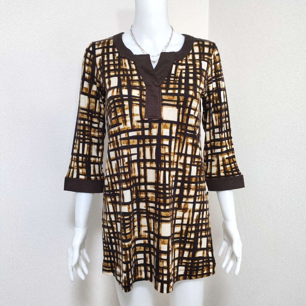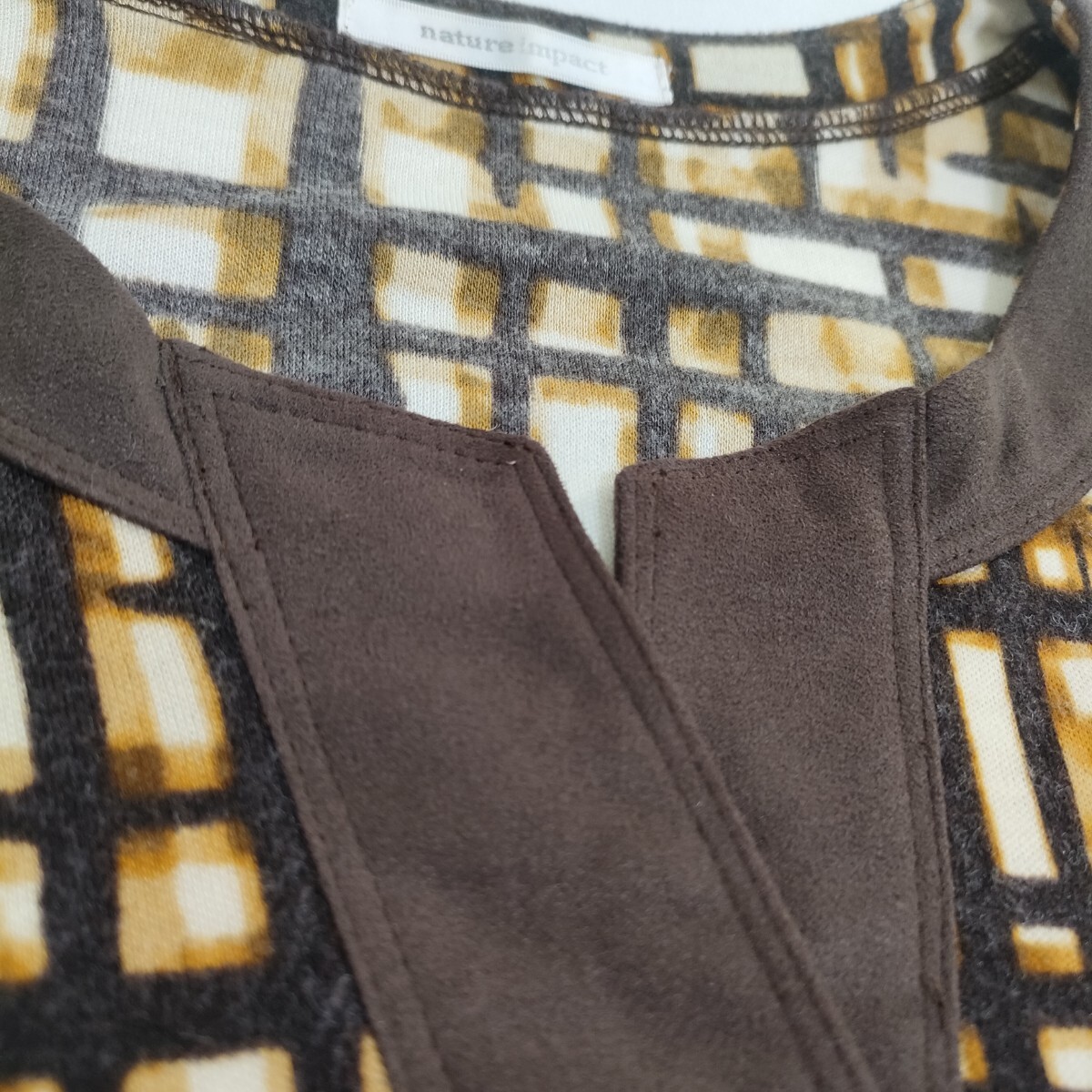 nature impact ネイチャーインパクト 幾何学模様 チュニック カットソー ブラウン 7分袖 キーネックデザイン アクリルウール