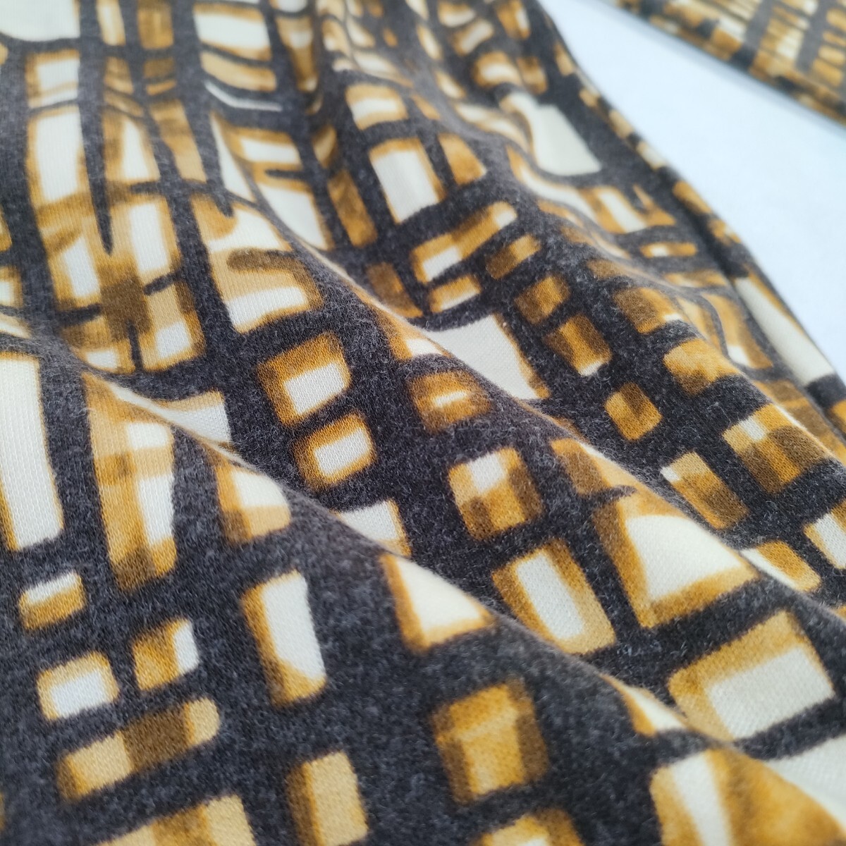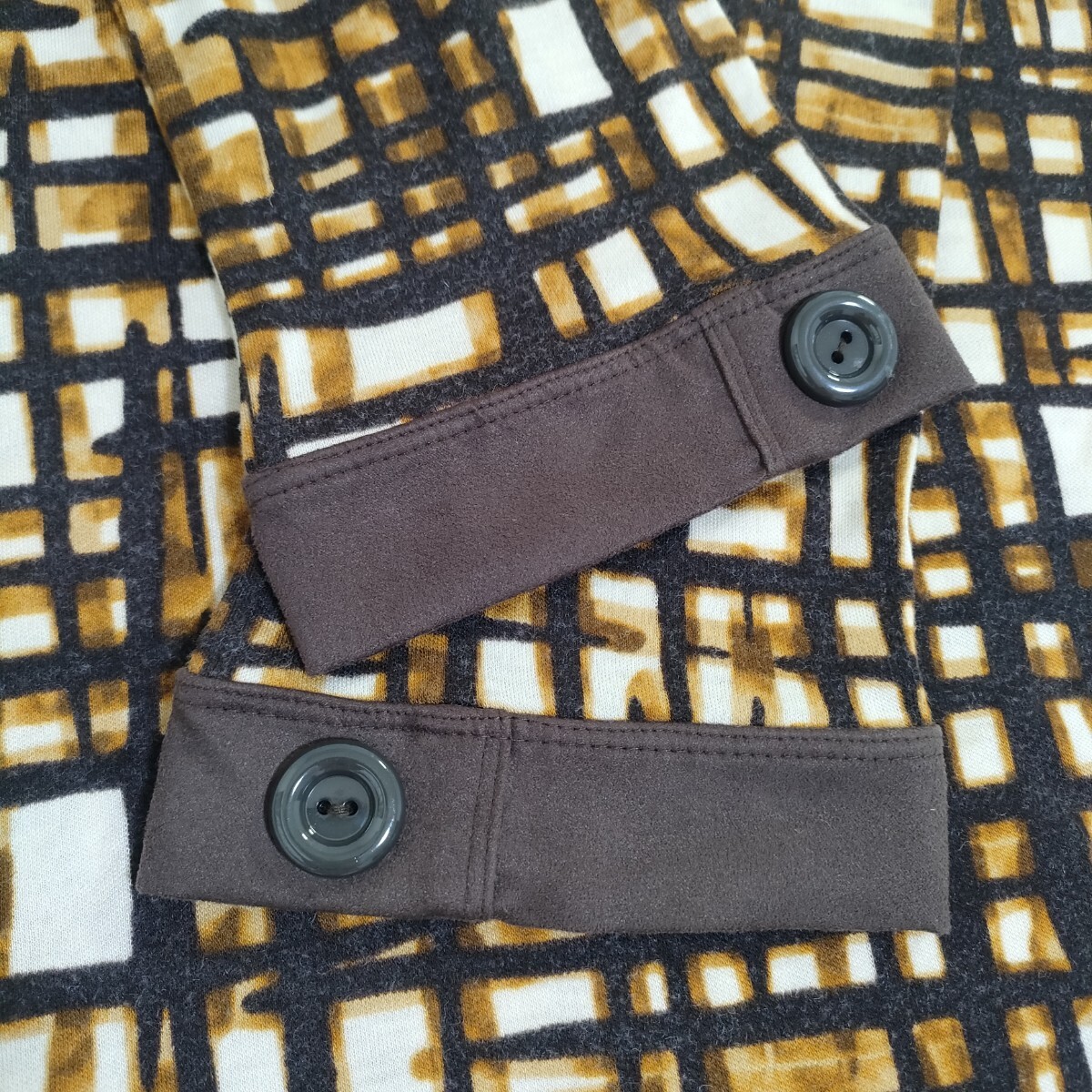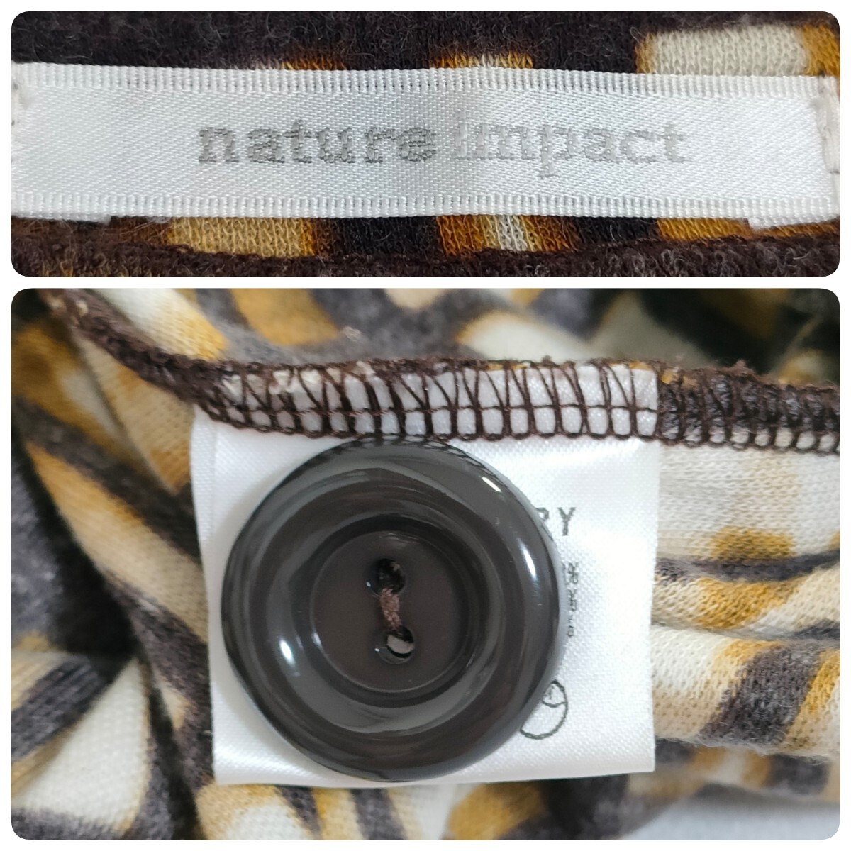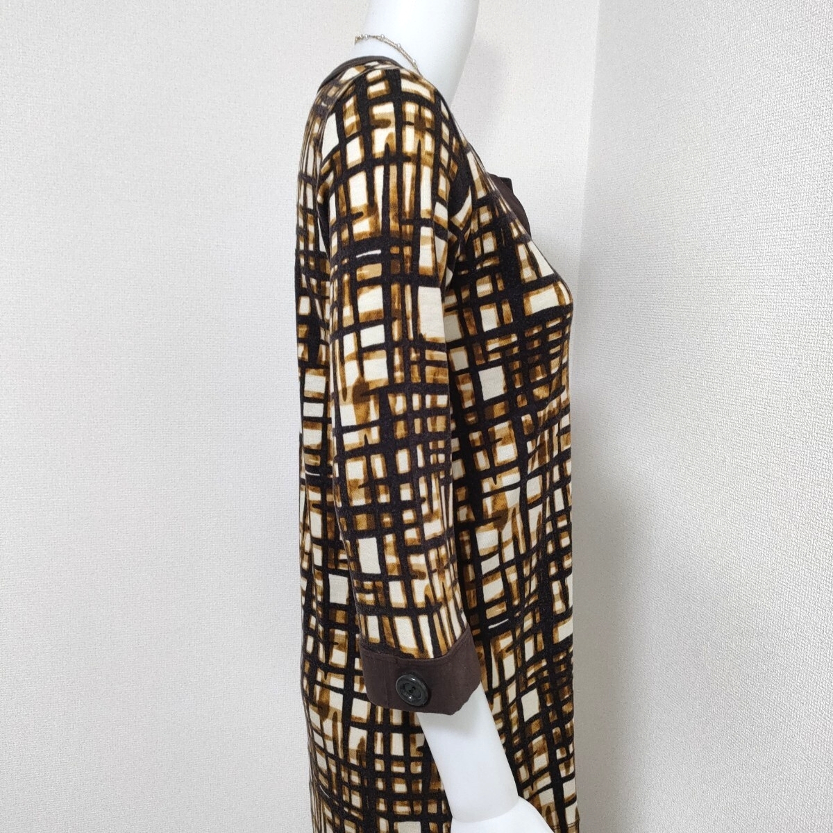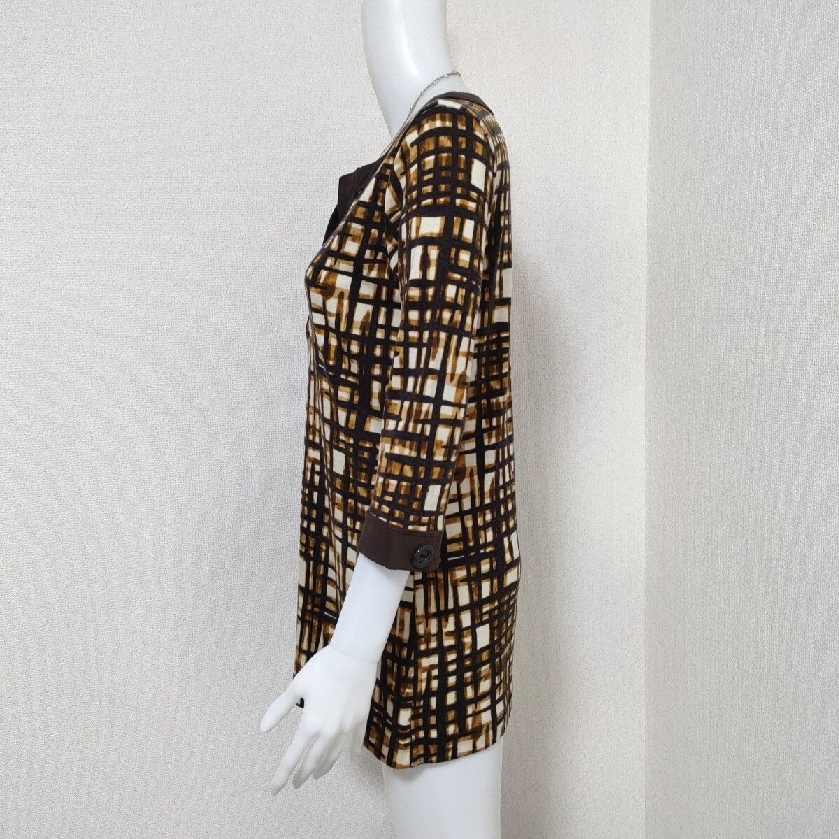 nature impact ネイチャーインパクト 幾何学模様 チュニック カットソー ブラウン 7分袖 キーネックデザイン アクリルウール